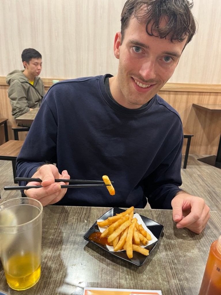 Für Fabian soll ich einen Taiwanesen antippen, damit der mit ihm Clash Royale spielt. Weil dann aber Pause ist, vertagen sie das: „After the break!“ Mit Fabian, Phillip und Sidd laufe ich ins „Louisa“, ein Studentencafé. Fabian ist begeistert, dass ich auch Clash Royale zocke und erzählt aufgeregt vom neuen Update, in dem Kartenlevel 16 und Fähigkeiten für Ritter, die drei Musketiere und den Riesen eingeführt werden. Mit Sidd gehe ich kurz den Plan für Taipei durch und er erzählt mir, was ihn gestern Abend beschäftigt gehalten hat. Ich vergesse immer, dass er einen Remote-Job für die USA hat. Irgendwelche „clients“ sind nicht zu einem Termin um 10 Uhr (bei uns 2 Uhr nachts) aufgetaucht und wollten diesen auf 12 Uhr (also 4 Uhr) reschedulen. Das hat er dann aber nicht mit sich machen lassen. Fabian und Phillip überlegen, mit nach Teipei zu kommen und zögern zuerst, bis sie von den niedrigen Zugpreisen des Fast Local Trains (also der mit den weniger Haltestellen) hören. Irgendwie war ich nicht davon ausgegangen, dass Geld für die Österreicher eine so große Rolle spielt, aber das macht sie in meinen Augen umso sympathischer. Für coole Abenteuer kann man ruhig mal ein paar Strapazen auf sich nehmen.