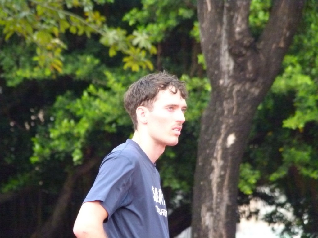 (Herr) Son und seine Helferlein verbringen äußerst lange mit der Ausrichtung und Höhe der Latte. Löblich, und sogar verständlich, denn sie kämpfen mit stumpfen Waffen. Die Ständer wackeln bei der kleinsten Berührung und die Höhe wird nicht wie sonst mit einem Messergerät oder wenigstens einem Zollstock, sondern mithilfe eines (äußerst biegbaren) Maßbands ausgemessen. Aber so sei es, los geht’s. Ein großer Athlet mit der eigentlich perfekten Hochspringer-Statur stellt sich als schwach heraus: Nachdem es mit dem Flop nicht geklappt hat, wagt er den Streddle, reißt dabei aber die Latte mit einer Wucht ein, als wäre es ein Kuhgatter, das gestürmt wird. Er schafft es allerdings noch, während ein anderer nullt. Ein Typ in grünem Shirt zeigt eine sehr solide Technik, kann richtig weit ins Hohlkreuz gehen. Auch für Byron ist die Höhe kein Problem. Ich folge ihm nach, den Absprungschritt merke ich zwar deutlich im Puls der Nervenbahnen, aber es funktioniert.