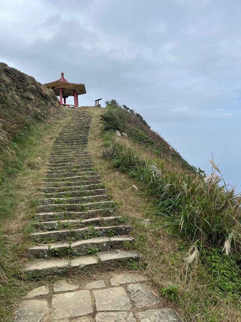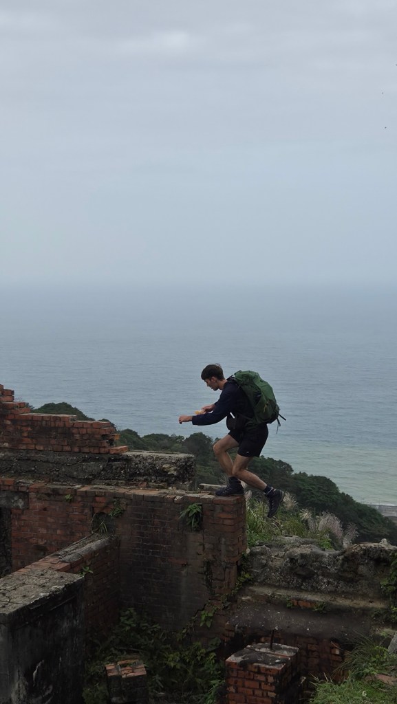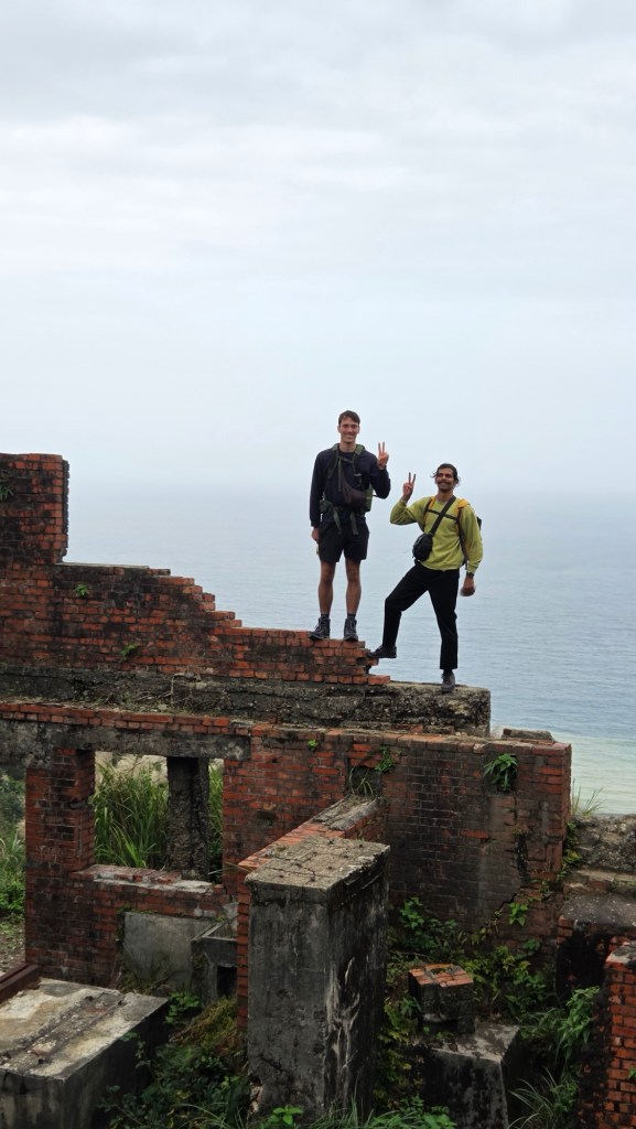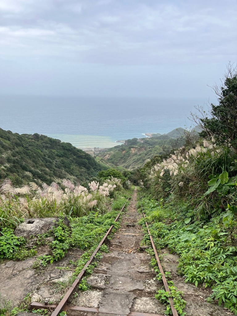 Schließlich nehmen wir den Bus, der uns in zehn Minuten an den Beginn eines Wanderwegs bringt. Ziel ist der „Teapot Mountain“. In meinen Wanderschuhen schmerzt der linke Fuß nicht mehr so sehr, außerdem bin ich jetzt mehr oder weniger gegen Umknicken resistent. Auf einer quasi unbefahrenen Straße läuft man am Berghang vorbei und kann nach links eine atemberaubende Aussicht auf das Meer genießen, welches bereits ein ganzes Stück unterhalb liegt. Eine quadratische Ruine verdeutlicht das umso mehr, als dass von ihr in steilem Winkel zwei Schienen abgehen, über die garantiert Lasten vom Hafen hochgezogen wurden. Das Meer um den Hafen herum ist merkwürdig grün, vielleicht eine Alge? In den Gemäuern, die vielleicht noch von den Japanern stammen, deuten sich außerdem Fundamente großer Apparate an. Ein taiwanesisches Ehepaar macht gerne Fotos von uns.
