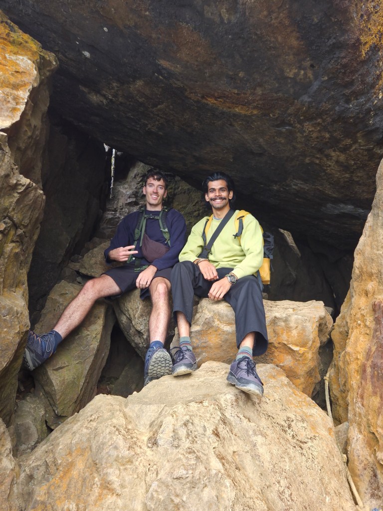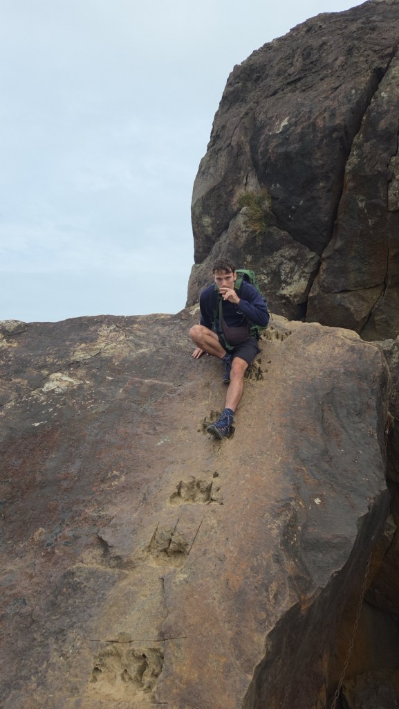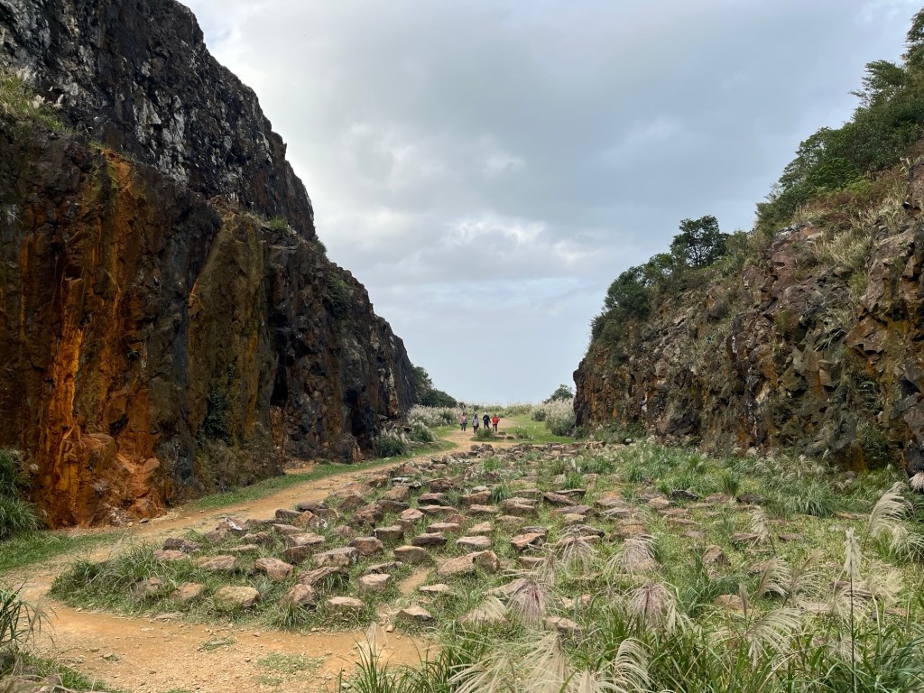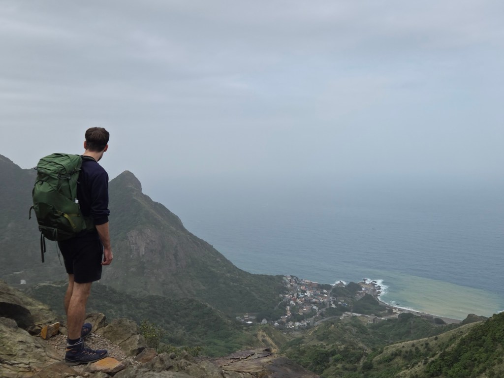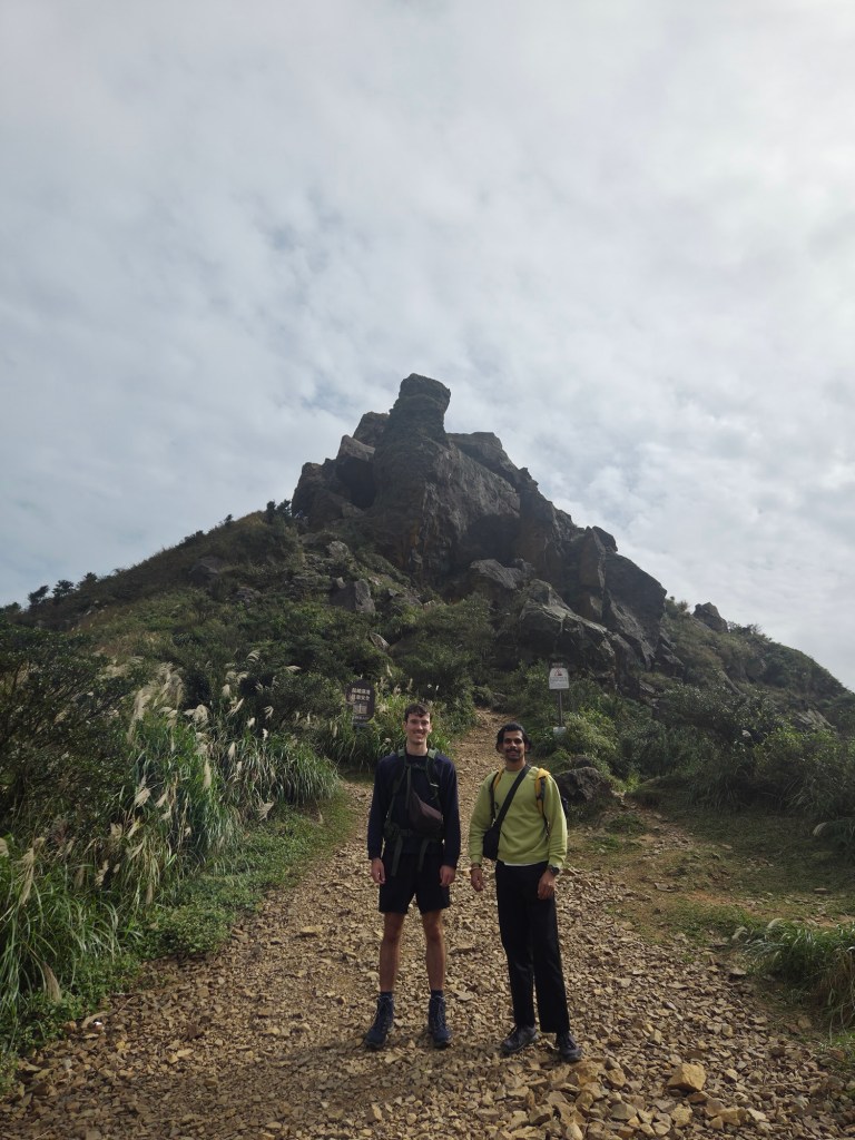 Als ich dann endlich hochdarf, offenbart sich ein noch besserer Ausblick als zuvor. Viel Bewegungsraum gibt es nicht, relativ schnell warnen Schilder vor Rutschen und Absturzgefahr, tatsächlich geht es zu beiden Seiten steil bergab. Allerdings traut sich eine Gruppe hinter uns, die aus Einheimischen und einem unentwegt lächelndem französischen Pärchen besteht, weitere Steine zu queren, über in einen Felsen gehauene Trittstufen. Ein schöner Ort fürs Mittagessen. Natürlich dürfen auch die deutschen Stimmen nicht fehlen. Zwei Mädels in Alltagsklamotten, die sich einen Rucksack teilen, kommentieren das Geschehen und Gesehene trocknen, nicht ohne jeden zweiten Satz mit einem „Bro“ zu versehen. Eigentlich verhalte ich mich in der Gegenwart von anderen Deutschen gerne unauffällig (ich werde auch nie als Deutsch identifiziert), aber Sidd schaut mich vielsagend an und sagt „give it a try“. Es lohnt sich wirklich, denn die beiden erzählen von einer Rundroute, die sie wandern, ohne das wären wir vielleicht einfach umgekehrt. Ein unscheinbarer Weg hinter dem Berg führt weiter ins Gebirge, die Route ist sogar auf dem wenig mit Informationen versehenen Komoot eingezeichnet. Die Mädels kommen aus München und machen Auslandssemester in Hongkong und Kuala Lumpur, da kann man sich mal in Taiwan treffen. Aber nur, wenn man aus München kommt. Hinter der Bergkuppe befindet sich auch der blonde Franzose, den seine Gruppe die ganze Zeit schon mit „Antoine!“ gerufen hat. Auf einem Vorsprung über uns sitzt außerdem die ganze Zeit schon ein anderer Blonder, der auf seiner Gitarre einige Akkorde anschlägt. Idyllisch.