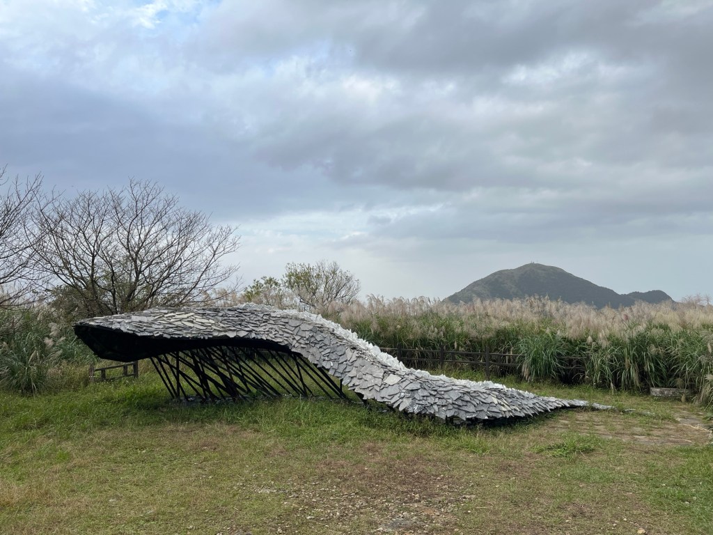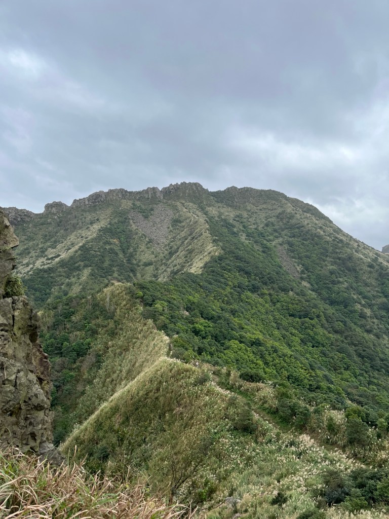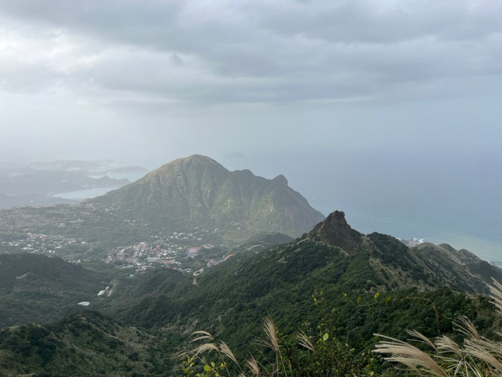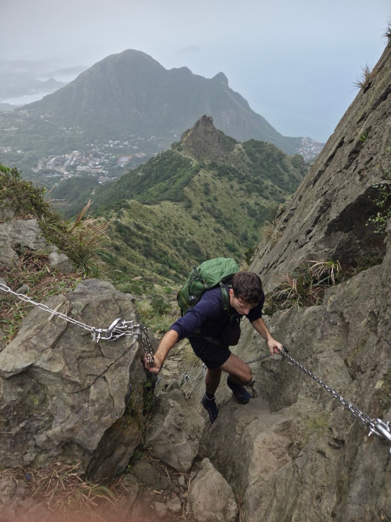 Der höchste Punkt der Route misst 705 Meter über dem Meeresspiegel, nicht schlecht. Kalt ist es außerdem, am besten bleibt man in Bewegung. Immer wieder helfen Ketten und Seile beim Klettern, in erster Linie kann man dadurch aber Entgegenkommenden ausweichen. Endlich reicht das Blickfeld übrigens 360 Grad rundherum, so kann ich mir auch die Berge weit hinter uns anschauen. Der 半平山 „Banpingshan“, nicht zu verwechseln mit seinem Namensvetter in Kaohsiung, ist Teil von Taiwans nordöstlicher Ecke, in zwei Himmelsrichtungen sieht man Ozean. Weil langsam die Sonne herauskommt und die grünen Erhebungen im Hinterland beleuchtet, sieht die Ferne nach flauschigen Decken und Kissen aus, wundervoll. Auf einem baumlosen Gipfel nebenan befindet sich ein hässliches, kantiges Gebäude, das stark nach wissenschaftlicher Einrichtung aussieht und eher abschreckt.