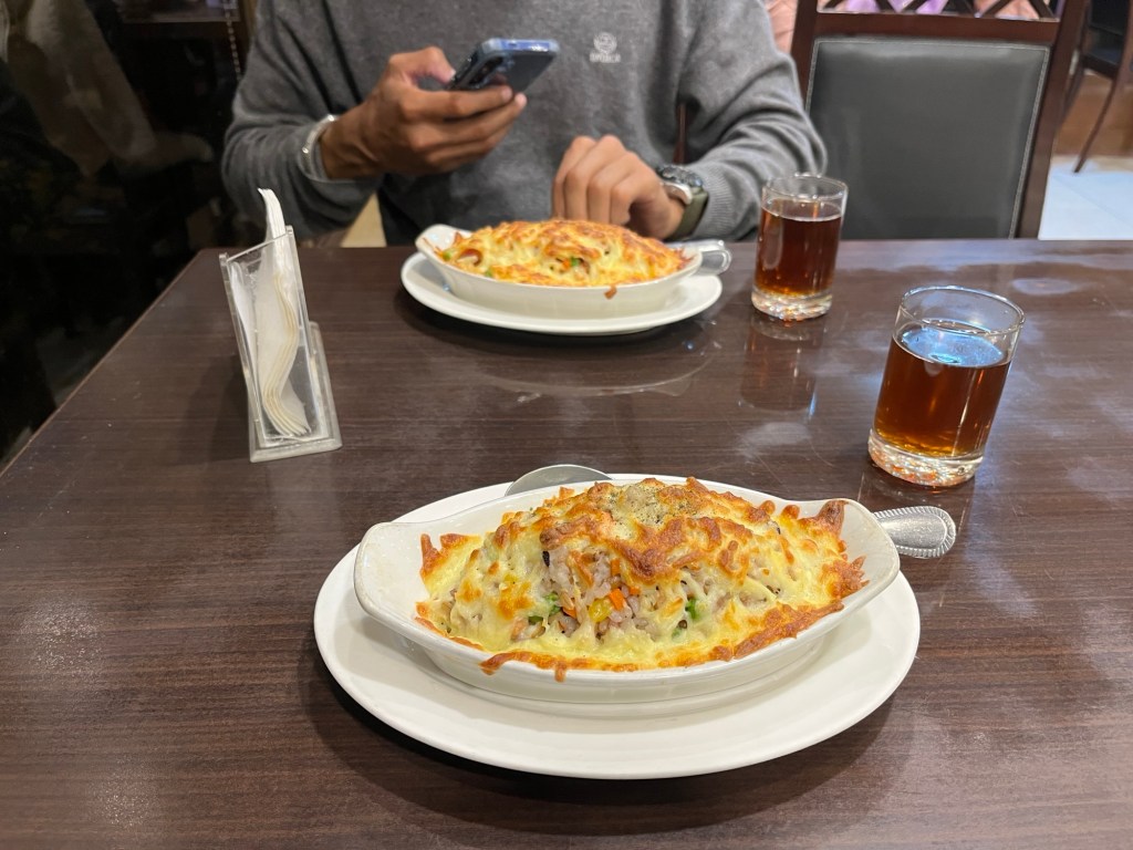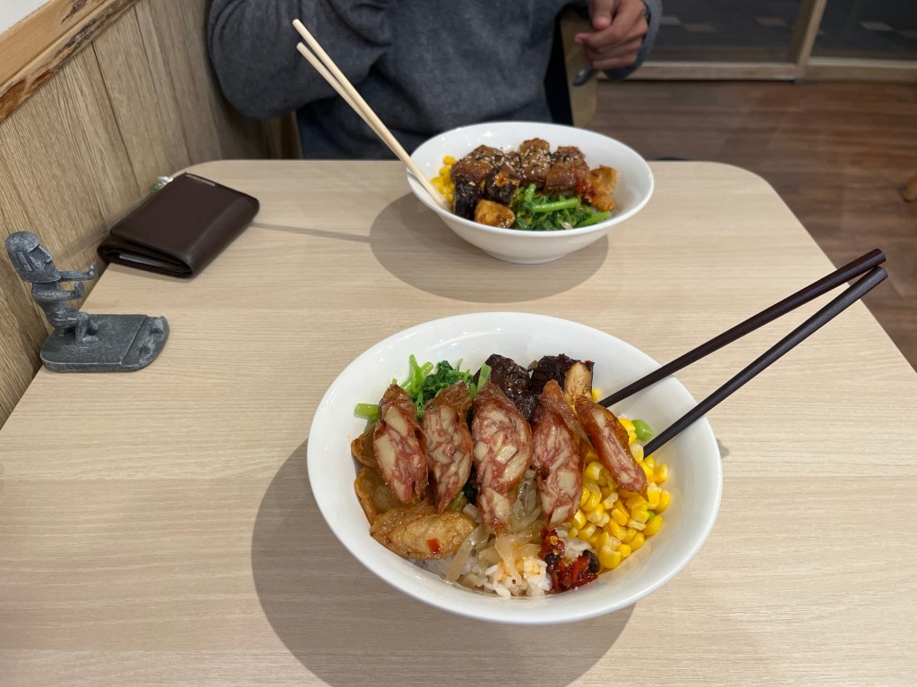 Die Wanderung hat müde, aber auch hungrig gemacht. In einem großen Budda-Tempel findet sich ein entsprechend vegetarisches Restaurant, Käsereis und -nudeln legen die Grundlage. Ein anderes Veggie-Restaurant versorgt uns mit Bowls, wobei mein Wurstimitat eindeutig süß und etwas nach Banane schmeckt.