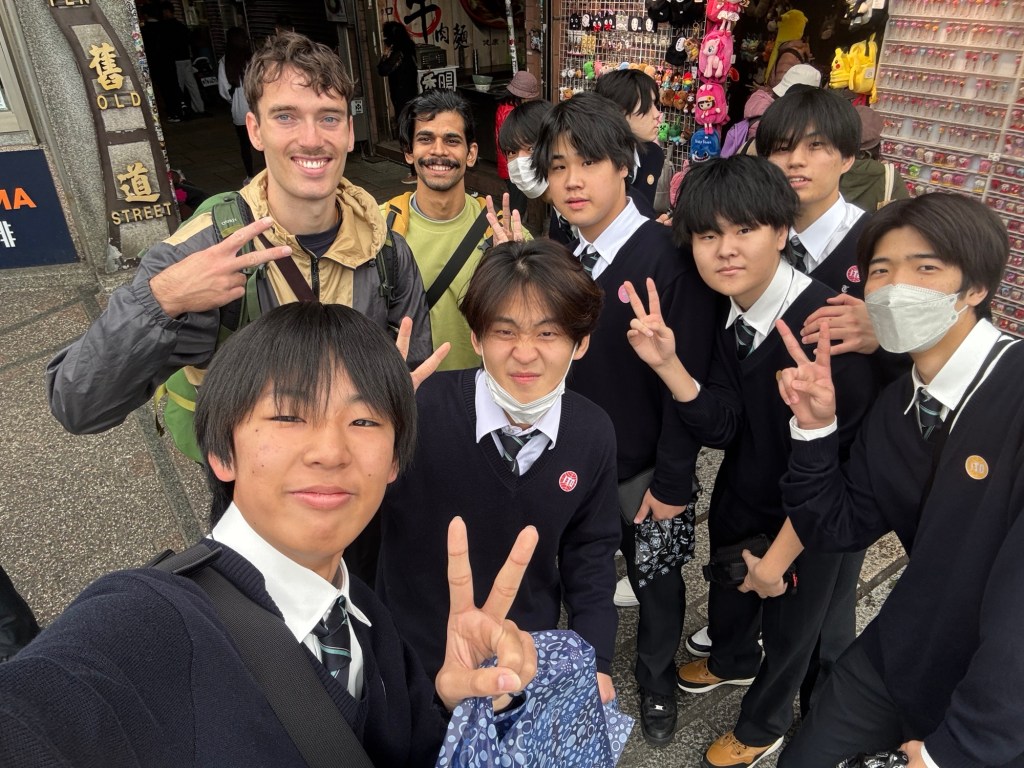 Frühstück gibt’s im FamilyMart und als wir vor dem ikonischen Eingang der Attraktionsgasse ein Bild zu zweit machen lassen, werden wir von einer großen Gruppe japanischer Studenten oder Schülern angesprochen. Sie wollen unbedingt ein Bild mit uns machen, und bevor sie weiterziehen können, lasse ich es mir geben, woraufhin der Junge Instagram austauschen will. Sofort landen wir in der Story mit fettgedrucktem „Danke!!!“. Auch andere japanische Jungsgruppen in Schuluniformen (sie könnten glatt aus Hogwarts kommen) schwärmen in die Gasse. Dachte ich, dass ich mittlerweile asiatische Gesichter gut auseinanderhalten kann, wo belehrt mich ein Jungstrupp voller kurzgeschorener Köpfe eines Besseren.