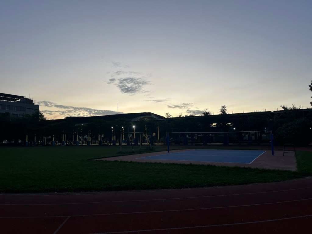 In der Cooldown-halben-Stunde am Schluss gehen wir zu fünft Speer werfen. Róng, dessen Lieblingswort immer noch 讚 „zàn“ ist und der breit grinst, wenn ich es verwende, leitet Momo und ein bisher meist stilles Mädchen mit schwarzer Brille an, ich folge. Als Ray dazukommt, machen wir einige Würfe vom Tartan aus, dabei werfe ich erstaunlicherweise am weitesten. Die Technik der Jungs sieht denke ich deutlich besser aus und sowieso habe ich nie mit dem Speer geglänzt, aber irgendwie landet meiner jedes Mal weiter hinten. Dafür zahlt meine Schulter mit dem Aktivieren einiger Nervenbahnen. Klar, dass die ungewohnte Belastung das verursacht, es passiert ja sogar geübten Speerwerfern. Das Laufen über die Wiese bringt die Gruppe ins Gespräch und Momos Neugierigkeit greift um sich. Sie hat gesehen, dass ich in 九份 „jiǔfèn“ war und will unbedingt wissen, was ich gegessen und wie gefunden habe. Viel Zeit verbringt die Gruppe damit, sprachliche Missverständnisse auszuräumen, was allgemein frustriert. Aber es klappt irgendwie, meine Kenntnisse über taiwanesisches Tofu, Bubble Tea, Taro Bällchen und Taoyuans Foodspots (Momos Heimat) wachsen. Ziemlich witzig finde ich die vielen lauten 那個 „nàge“, die ja ein sehr beliebtes Füllwort sind, allerdings gefährlich verboten klingen. Ich muss mich zurückhalten, nicht jedes Mal ein ungläubiges Grinsen über mein Gesicht huschen zu lassen, auch wenn es sowieso niemand auf Rechnung hat. Was meine Lieblingssache an Deutschland ist? Irgendwie komisch, darüber so lange nachzudenken, als gäbe es nichts Gutes in Deutschland. 德國啤酒 „déguó píjiǔ“, deutsches Bier, ist vielleicht nicht die beste Antwort, aber eine lustige. „Iiihh“ kommt es zurück, niemand mag hier Bier. „So… bitter!“ Ich habe mal wieder vergessen, wie vernarrt in Zucker die taiwanesische Bevölkerung ist. Das Beste an Taiwan? „Food!“ Vor allem die süßen Lebensmittel, na klar. Nach weiteren Würden zeigt Momo relativ plötzlich auf mein Gesicht und sagt irgendwas mit „beautiful“; ich sehe in ihren Augen wohl sehr entspannt aus, man könnte auch sagen, träumerisch. Ein gutes Zeichen, dann habe ich den Frust vom Nachmittag entweder gut versteckt oder schon wegtrainiert. Außerdem, Momo zeigt Kreise mit ihren Fingern, findet sie meine Locken schön. Wenn das schon als Locken gilt, sollte sie mal sehen, wie ich vor zwei Jahren aussah… Aber Spaß beiseite, ich fühle mich natürlich sehr geehrt, diese ganzen Komplimente zu bekommen, aber weiß kaum, wie ich darauf reagieren soll. Klar bedanke ich mich herzlich, und ich will gerne irgendwas zurückgeben, aber sowohl einem vergebenen Mädchen als auch einem 14-jährigen Jungen (Ian) ziemt es sich nicht gerade, ihre Augen oder sonstwas zu loben. Ich weiß, dass man das durchaus kann, aber ich fühle mich nicht ready, das cringefrei rüberzubringen. Gerade, weil ich in die Gruppendynamik und ihren Humor nur begrenzt involviert bin.