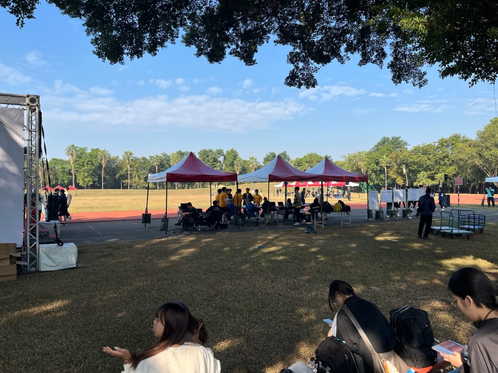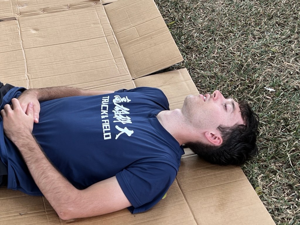 Weil ich kein Helfer bin, steht mir eigentlich keine Lunchbox zu, aber Daniel ist so lieb und organisiert mir nach einiger Suche sogar eine der wenigen vegetarischen. Dazu gibt es einen Trauben-Honig-Drink aus einer Plastikflasche, in der die Saftmasse einen gefrorenen Anteil umfließt. Traditionell taiwanesisch, wie ich höre, und echt lecker. Die Mittagspause ist ziemlich lang, auf einer kleinen Seitentribüne essen alle oder chillen am Handy. Byron und andere zerreißen sich Pappkartons und legen sich schlafen, was ich nachtue. Am Pausenende bleibe ich einfach liegen, was soll ich auch sonst tun. Ganze zwei Stunde schlafe ich auf der Wiese, bis Byron mich weckt und hektisch an meine Zusage erinnert, bei der 20*100-Meter-Staffel mitzumachen, was zugegeben echt lustig klang. Ich beiße die Lippen gestikulativ zusammen, aber er nimmt das nicht hin – ich soll einfach laufen, egal wie langsam, denn einen anderen Läufer finden sie jetzt nicht mehr. Da kann ich schlecht nein sagen. Zeit für die Toilette bleibt auch nicht, also mache ich mich so gut warm, wie es in der Situation nur geht. Dynamisches Dehnen und den Kreislauf in Schwung bringen, das muss reichen.