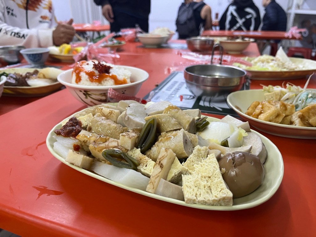 Abendessen gibt es wieder im Restaurant der jüngsten Wahl, die Vorlieben der Gruppe wechseln wohl phasenweise. Auf Rays Roller rasen wir wieder mit 78 km/h über die Brücke, die ich mich normalerweise mit den YouBikes hinaufquäle. Bei gelben Ampeln wird selbstverständlich beschleunigt, aber Ray ist vorsichtig genug, ab einer gewissen Entfernung dann doch stark abzubremsen. Das Büffet hat nicht die allergrößte Auswahl, so ergibt sich für mich fast das gleiche Abendessen wie die letzten zwei Male. Allerdings ist es billig und viele verschiedene Soßen, unter denen einige tatsächlich scharf sind, runden den Geschmack gut ab.