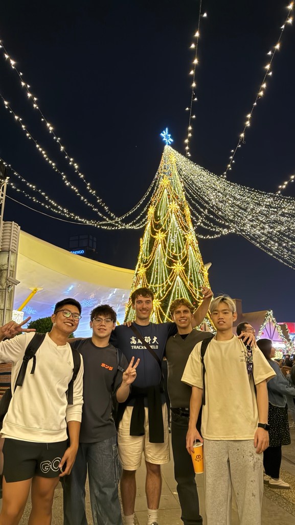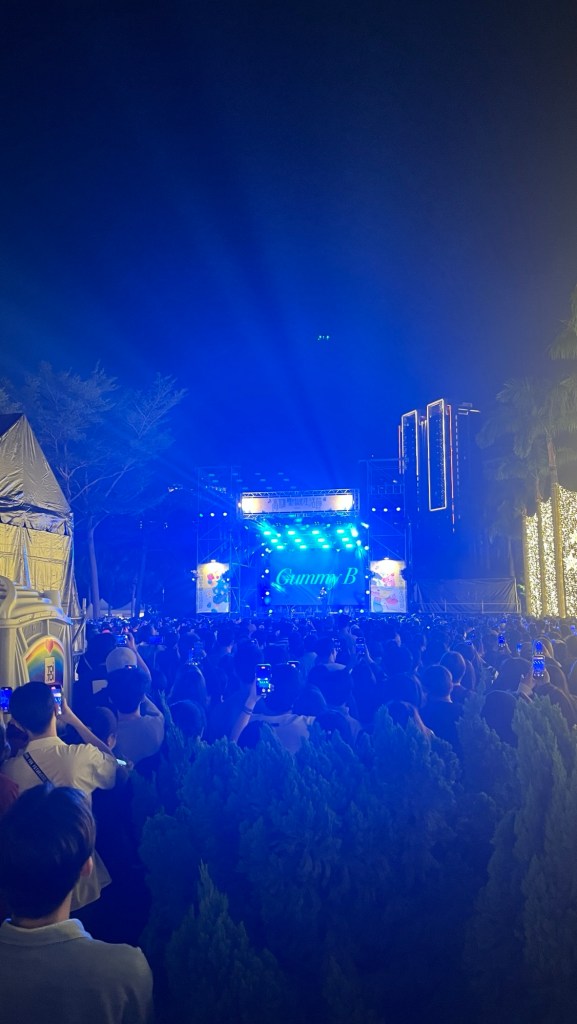 Himhim und Fabi wollen, dass ich im Park auf die Bühne des heutigen Konzerts gehe und bitte, ein deutsches Weihnachtslied singen zu dürfen. Himhim hatte zuerst vorgeschlagen, dass ich für ihn asiatische Mädchen ansprechen soll, quasi als Wingman, aber Fabian findet das zu einfach. Glücklicherweise sieht es kaum so aus, als könnte ich einfach auf die Bühne gehen, denn unten drängen sich die Massen und fiebern dem anscheinend prominenten Gast entgegen. „Gummy B“ ist ein junger taiwanesischer Künstler und singt eine Menge Popsongs, bei denen manche Fans sogar kreischen. Himhim lehnt meine Verkupplungsangebote ab, betont aber, dass er nicht gay sei. Alternativ muss ich versuchen, glitschige Steine eines Teiches zu überqueren, allerdings stellt das die geringste Herausforderung dar. Die Atmosphäre ist toll, auf dem Hauptplatz fliegen wieder gasige Seifenblasen umher, die sich bei Berührung in Rauch auflösen. Weihnachtliche Klänge ertönen, Familien sitzen auf einer Anhöhe, lassen ihre Kinder in Säcken den Hügel abrutschen und schauen auf den großen Bildschirm, der das Konzert vervielfältigt. Die Songs gefallen mir auch, einige shazame ich.