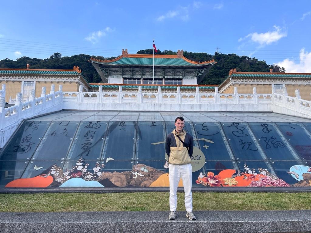 Ein Palastgarten empfängt die Besucher mit Teichen, Skulpturen, Blumen, großen Pavillons und nichtlinearen Laufwegen. Ich sehe andere Menschen, die alleine unterwegs sind, was mir irgendwie Auftrieb gibt. Jeder ist für sich, die meisten spazieren mit Kopfhörern und bleiben ab und zu für ein Foto stehen. Was für ein Glück, dass die Berge so nah an Taipei sind, das sieht echt super aus!