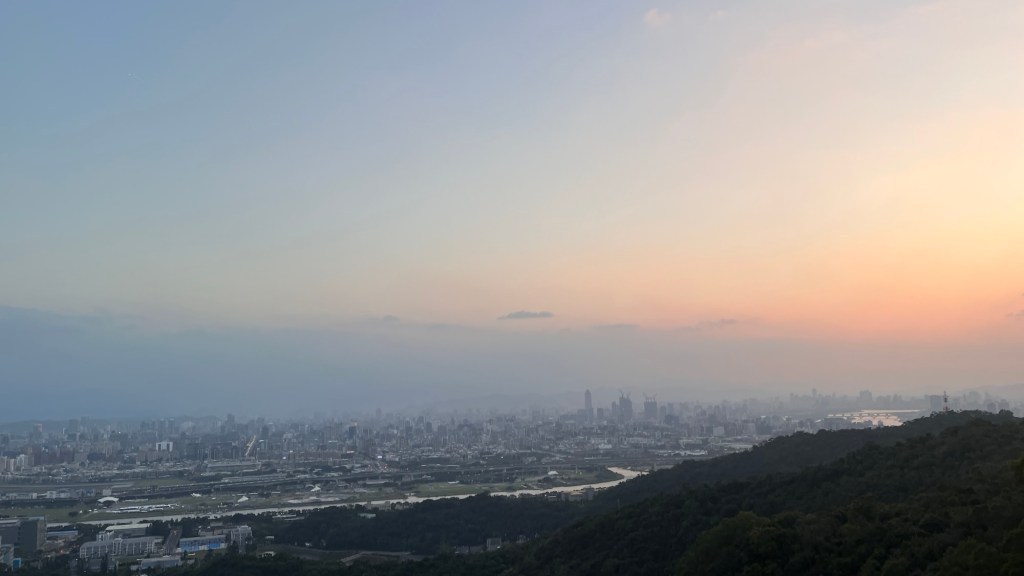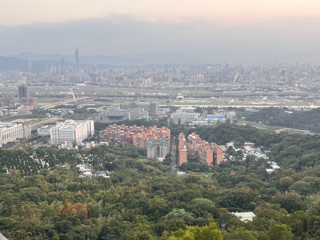 Jetzt laufe ich wieder der Gruppe junger Studis hinterher, sie scheinen zu wissen, wo es hingeht. Das wäre doch die perfekte Gelegenheit, mal mit Leuten zu reden, denke ich. Der Weg ist aber schmal und ich komme nichtmal an einer Person vorbei, ich warte. Der Sonnenuntergang spielt dann doch keine Rolle, weil das Aussichtsdeck nur nach Süden schaut, aber das ist auch okay. Der Blick ist atemberaubend, wie im Wimmelbuch kann man minutenlang umhergucken und entdeckt immer noch neue Details. Neben Taipei 101 und den Bergen sehe ich den Tamsui River auf der rechten Seite, unglaublich viele breite Straßen mit regem Verkehr, im Dunst verschwindende Hochhäuser und natürlich den Flughafen. Von hier aus sieht es so aus, als läge er in der Innenstadt und ganz so weit ist das auch nicht hergeholt. Alle staunen, als Flugzeuge landen, aus der Ferne sieht das extrem langsam aus. Wie im Miniatur-Wunderland. Zu unseren Füßen, am Stadtanfang, erstreckt sich ein Kiez, dessen Häuser so nah beieinander stehen, dass er bestimmt kaum lebenswert sein kann. Ich höre die Studentengruppe über einen möglichen Satelliten am Himmel diskutieren, alle in gestelztem Englisch. Eigentlich will ich irgendwas sagen, habe dann aber kaum Lust darauf und schaue lieber vor mich hin. Als sie dann ein Gruppenfoto machen, trete ich beiseite und mache mich auf den Rückweg. Irgendwie ärgere ich mich trotzdem darüber, denn grundsätzlich habe ich das Bedürfnis, Leute anzusprechen. Nächstes Mal nicht so lange überlegen, einfach machen.