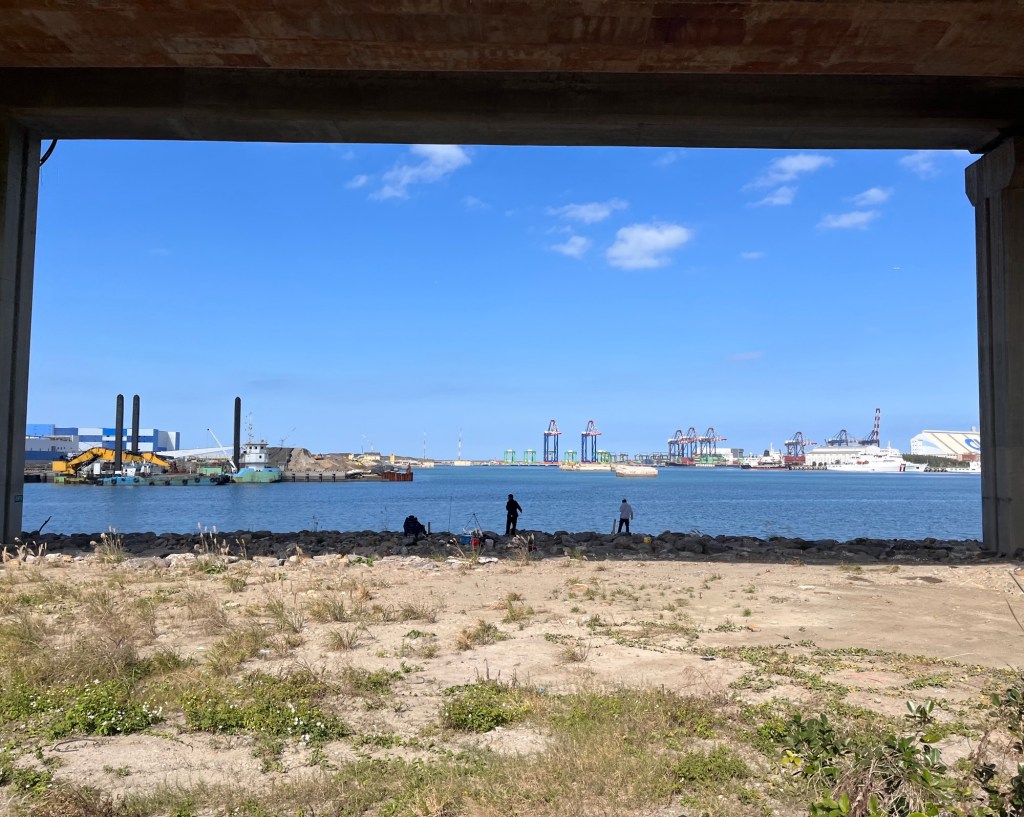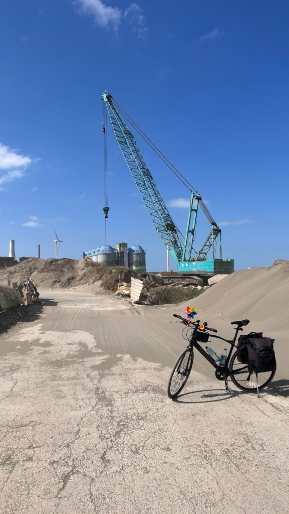 Entsprechend froh bin ich, als Google mich endlich runterschickt. Wie schon entlang der gesamten Küste erwartet mich eine fast dystopische Landschaft, und das meine ich ausdrücklich positiv. Während vorher noch ab und zu Segelsurfer und Angler zu sehen waren, sind hier nur noch Letztere anzutreffen, neben wenigen Bauarbeitern. Der Ort wird von Sandbergen und einigen Windrädern dominiert. Der Wind weht heftig und ich muss sogar kurz schieben, um nicht auszurutschen. Ein türkiser Kran vor meinen Augen und bemalte Industrietanks im Hintergrund geben eine wirklich tolle Kulisse ab.