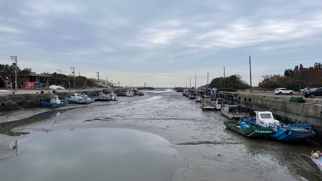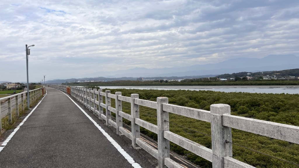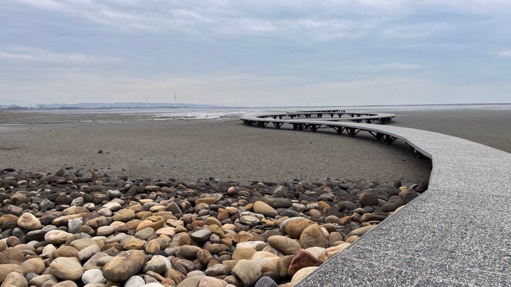 Heute soll es endlich mal früher losgehen, schließlich liegt die luftlinienmäßig längste Strecke vor mir. Dafür habe ich gestern extra schon Frühstück besorgt (ein Pfannkuchen aus der Plastikverpackung) und mithilfe von Feuersalbe und Ibuprofen sollte auch der Rücken keine größeren Probleme machen als gestern. Um kurz vor zehn verlasse ich also das Hostel und durchquere Hsinchu bis zum Strand, wo ich die Frühstückspause einlege. Das, was vor mir liegt, kann man fast schon als Wattenmeer bezeichnen, zumindest wird es 香山濕地 „Xiangshan Wetlands“ genannt (bezogen auf einen Elefantenberg). Eine weite Strecke jenseits des Ufers sind nur Pfützen zwischen den Sandwellen zu sehen, der Himmel ist bewölkt, die Offshore-Windräder am Horizont verschwimmen,, dazu vollkommene Windstille. Ein sehr ungefährlicher Laufsteg über den Sand ist trotzdem gesperrt, zwei Männer sitzen davor und essen ebenfalls. In 20 Minuten ist die Ebbe vollendet und bei genauem Hinschauen erkenne ich in allen Richtungen, jeweils sehr weit weg, kleine Figürchen, die hinausziehen, Krabben zu fangen. Zwei Störche tun es ihnen gleich, waten durch die breiteren Lachen und picken nach unten.