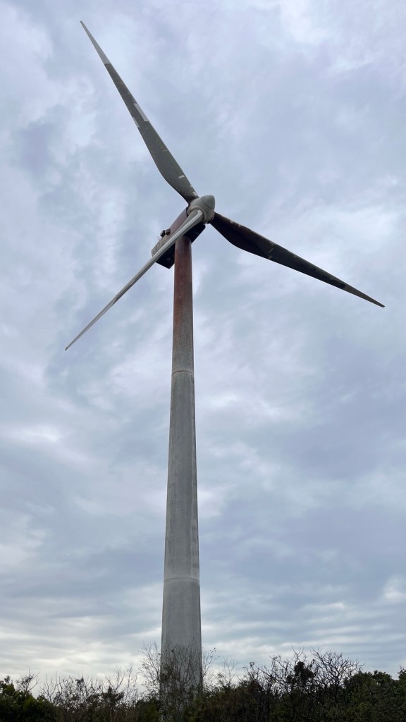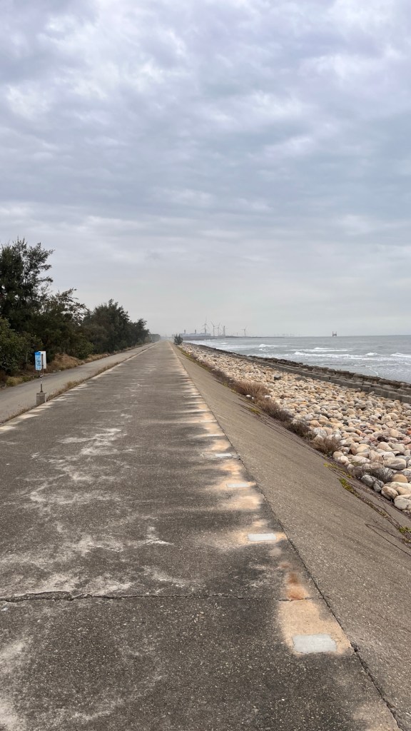Es ist kühl, sodass man eine Jacke nur weglassen kann, wenn man ausreichend schwitzt. Das Wellenrauschen ist in guter Distanz, nicht zu laut, nicht zu leise. Bestimmt kann man an den erlaubten Stellen gut baden gehen. Schade, dass Kaohsiung fast keine Strandgebiete hat, denkt man sich da nur. So etwas wie die Küstenwache auf vier Rädern in Inkarnation eines weißen SUVs quetscht sich über den Fahrradweg, kontrolliert alle paar hundert Meter die Strandeingänge. Ich sehe übrigens viele Motorräder, allerdings ohne die Besitzer. Ein bisschen angeschwemmtes Plastik darf auch nicht fehlen, zum Glück ist es nicht besonders viel. Die wenigen Windräder, die sich drehen, machen selbst aus nächster Entfernung keine Geräusche. Dabei erinnere ich mich, dass es in Deutschland so viele Beschwerden wegen des Lärmaufkommens gibt…
