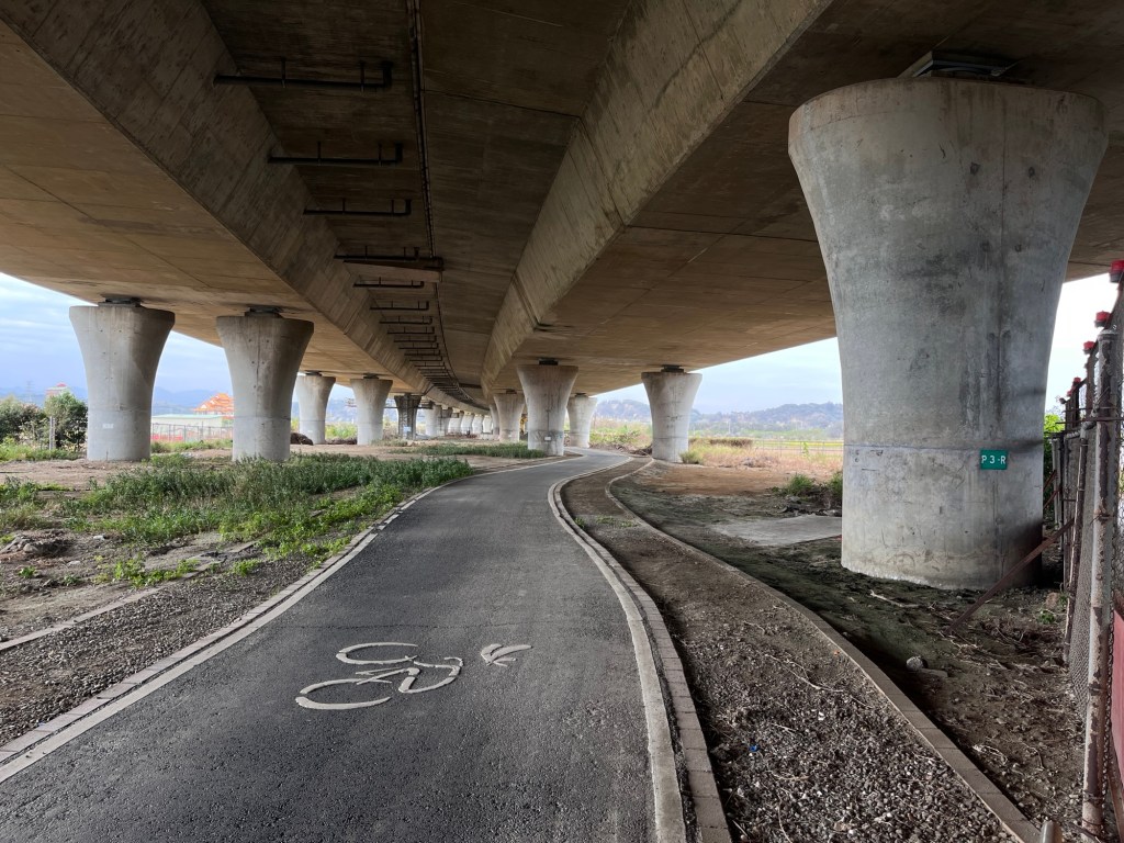 Als ich dann wirklich ins Landesinnere abbiegen muss, wird es schwierig. 16 Uhr, und Maps verspricht, dass ich noch gute zweieinhalb Stunden unterwegs sein darf. Die Abstecher zu interessanten Orten kann ich mir wohl abschminken, jetzt geht es nur noch um Effizienz. Ein Hostel sollte ich mir vielleicht auch noch buchen, zum Glück gibt es davon in den Großstädten immer billige. Für 700$TD (19€) für zwei Nächte komme ich sogar im Zentrum unter. Vorausgesetzt, ich schaffe es in die Stadt. Prinzipiell ist die Strecke hier nicht schlecht, es geht mehrheitlich über hochgestelzte Straßen über Felder hinweg. Genau genommen könnten auch die Felder abgesenkt worden sein, wer weiß das schon so genau. Das Fahren selbst ist aber ordentlich anstrengend. Entweder habe ich Gegenwind oder die Neigung der Strecke ist steiler als gedacht. Google sorgt regelmäßig für Umwege, etwa wenn mir nahegelegt wird, einfach auf die THSR-Strecke abzubiegen. Ich bekomme sogar einen vorbeischnellenden Schnellzug aufs Bild. Was sich schlecht einfangen lässt, aber wirklich wunderschön ist, sind die ganzen kleinen Vögel, die sich auf den allgegenwärtigen Stromleitungen sammeln und im zunehmend abendlichen Sonnenlicht mal hier, mal dort hinlebt flattern.
