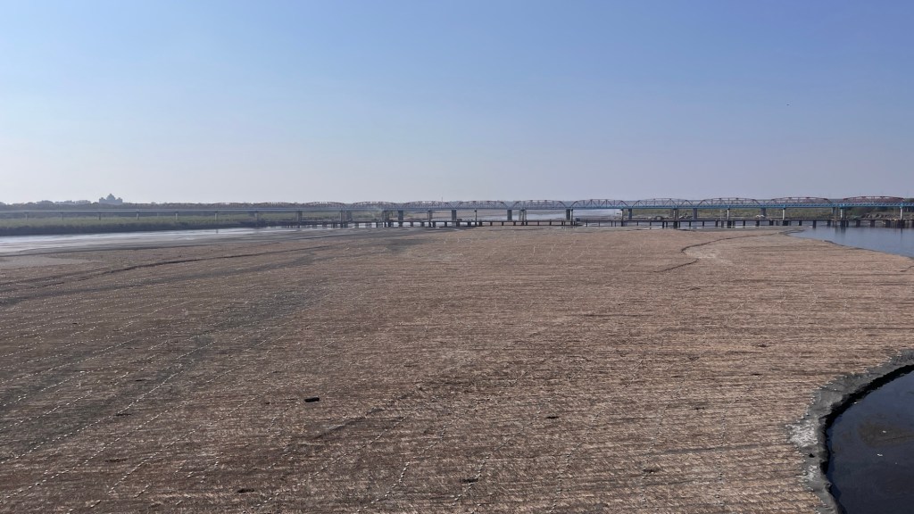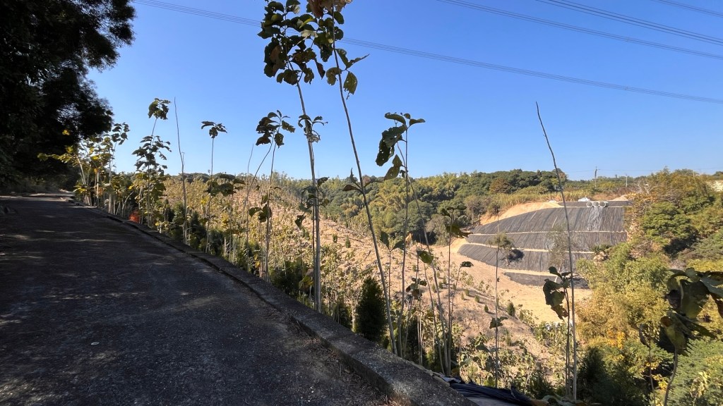 Wahnsinnig innovativ ist das Bauwerk natürlich nicht, das sehe ich auch aus der Ferne. Die schiere Länge und Wiederholung der Module fasziniert aber trotzdem. Der Fluss darunter ist auch nicht weniger interessant, vor allem, weil ich keinen Namen zu ihm finde. Er führt aktuell kaum Wasser, was sich in der Regenzeit aber stark verändern dürfte. Gerade bei der schieren Breite, vermutlich der breiteste Fluss, den ich in Taiwan bisher gesehen habe. Im Satellitenbild sieht man eine fast ausschließlich gerade Rinne, die aus den Bergausläufer schnurstracks Richtung Meer führt. Ziemlich untypisch für Flüsse, wenn man mich fragt. Zwischen den Randrinndalen befindet sich eine enorme Fläche, auf der Planen, Steine zur Befestigung und so etwas wie Saatgut ausgelegt sind. Mich interessiert brennend, wie das Flussbett wohl im Sommer aussehen mag. Ist dann alles geflutet, wie hoch steigt das Wasser?
