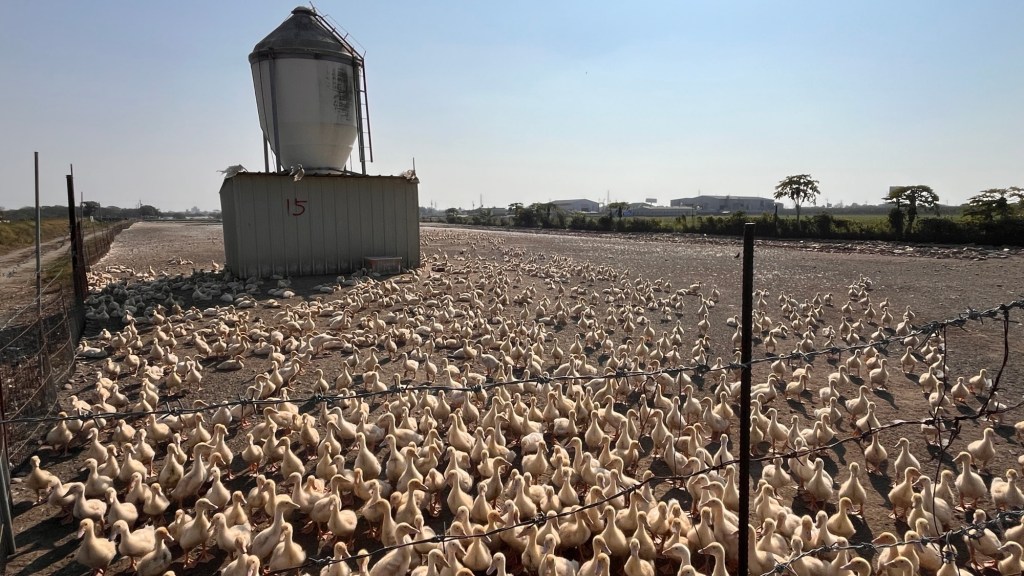 Nur wenig später führt mich ein Feldweg an einem Entengatter vorbei, auf dem ein einzelnes Silo steht. Je näher ich komme, desto näher watschelt mir auch die Armee der Alleskönner entgegen. Immerhin können Enten laufen, schwimmen und fliegen. Wer kann das sonst schon? Sonderlich gesund sehen die bemitleidenswerten Tiere auch nicht aus, der Gestank ersetzt jegliche Erklärung. Hoffentlich kursiert hier keine Krankheit in den Aerosolen! Von der nächsten Autobrücke erkenne ich das gesamte Ausmaß, viele Grundstücke der Gegend sind so aufgebaut, als hätte man sie in Minecraft gebaut und die Tiere endlos gepaart…