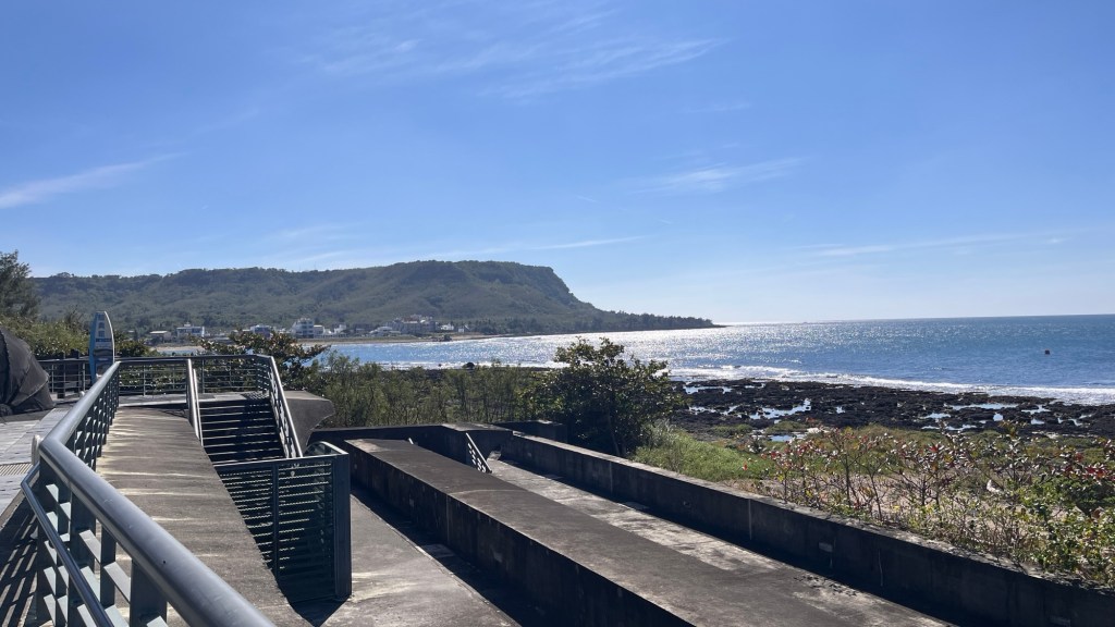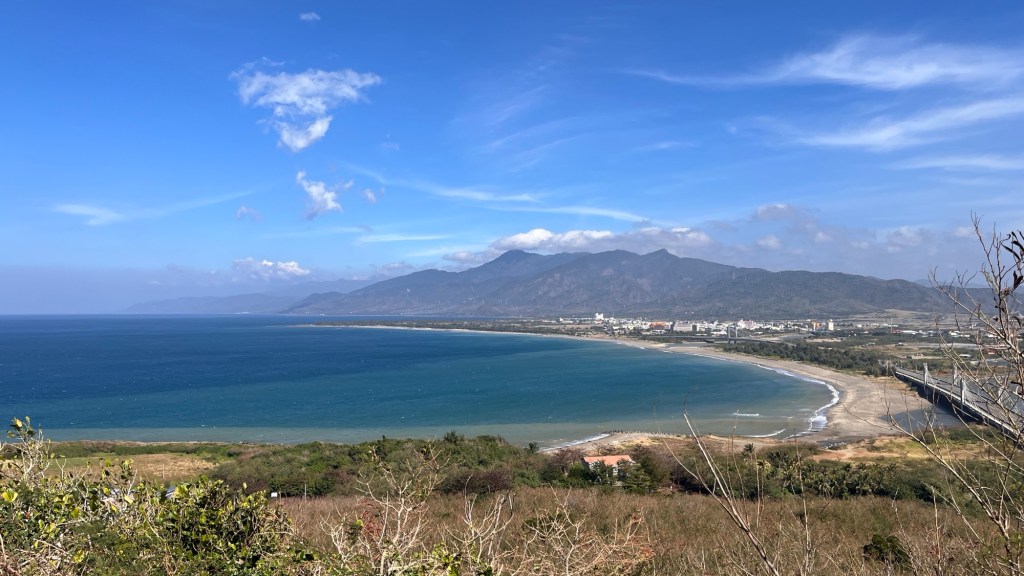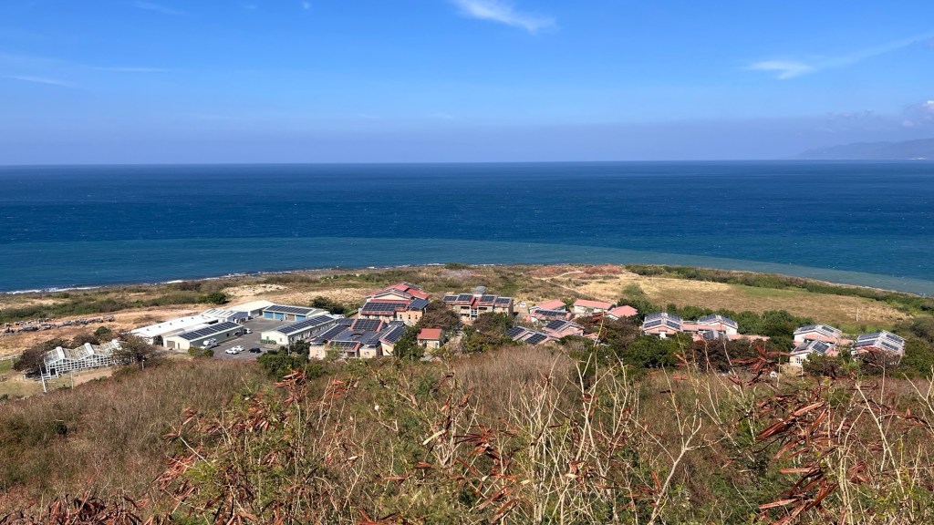 Ich gelange an eine alte Ruine, auf deren Mauern es sich schön sitzen lässt. Während Familien mit Kindern vorbeikommen, lasse ich die Beine baumeln, verzehre meine Brötchen und denke darüber nach, wie viel kälter es gerade auf Grönland sein muss. Aber nicht nur dort, bereits auf Höhe von Hualien sieht es ab übermorgen eher grau und kalt aus. Ich habe noch Zeit und Taitung scheint nicht betroffen, trotzdem sorge ich mich ein wenig. Andererseits kann ich es auch nicht ändern, nur den Sonnenschein hier aufnehmen. Sonnencreme habe ich übrigens drauf, gerade weil ich den dritten Tag in Folge mit kurzen Sachen fahre. Laut einem Infoschild stammen die alten Mauern aus der Zeit der Japaner, die 1874 (Zeit der Ching-Dynastie) einen lokalen Stamm ‚übernommen‘ und daraufhin ihre militärische Präsenz in der Region ausgebaut hatten. In der vor mir liegenden Bucht steht ein großer Gebäudekomplex, der auf den ersten Blick nach Luxusressort aussieht, laut dem Schild aber ein Museum über Maritimbiologie ist.