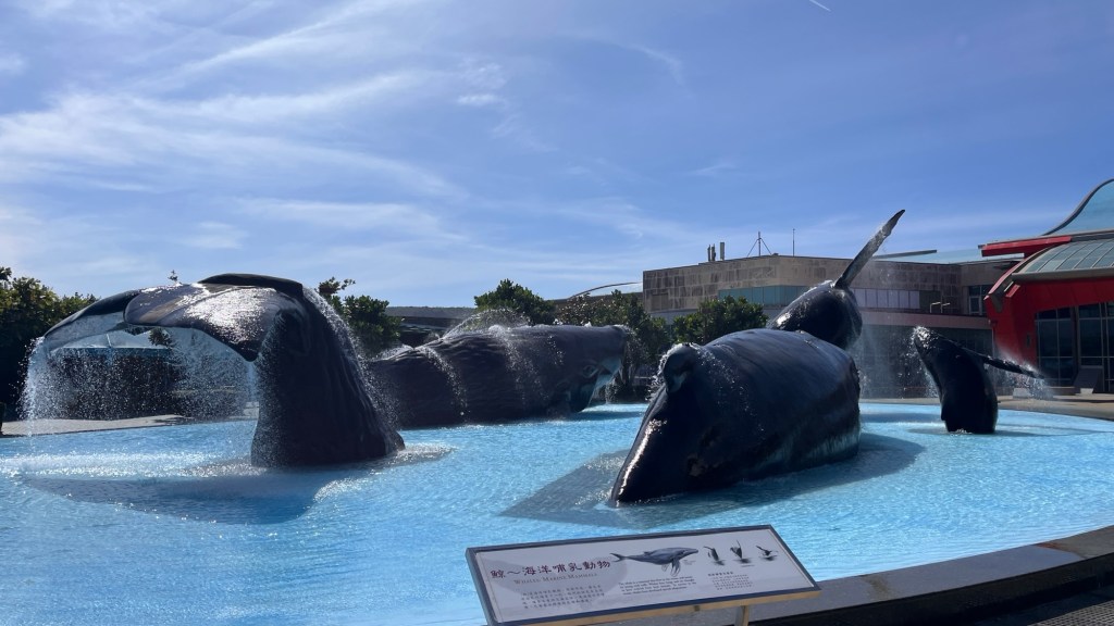 Dann fahre ich langsam weiter, und bevor ich mich zu Tode langweile, entscheide ich mich kurzfristig dazu, dem Museum nebenan einen Besuch abzustatten. Fahrräder parken kostenlos, aber auch sonst ist der überdimensionale Parkplatz höchstens zu zehn Prozent ausgelastet. Es gibt Studentenrabatt, sodass mein Ticket statt 450$TD (12,20€) nur noch 250$TD (6,80€) kostet. Wie schön, dass mein Ausweis gar kein Datum vom Semester enthält, damit kann ich theoretisch den Rest meines Lebens ermäßigte Eintritte in Taiwan bekommen. Zumindest, solange ich halbwegs nach dem Bild darauf aussehe. Eines der großen Gebäude ist wohl nur für Eingangsprozesse und die Abfertigung der Massen gedacht, dahinter wartet ein riesiger, weitgehend leerer Hof, den man zum Hauptgebäude überqueren muss. Obwohl, zwei Dinge gibt es doch: ein leeres Wasserbecken mit Plastikfiguren von Tieren und einen coolen Springbrunnen mit Walstatuen. Ein wenn ich genau überlege, doch recht teures Softeis für 100$TD (2,70€) schmilzt innerhalb von Augenblicken, besser ist es in der richtigen Ausstellung.