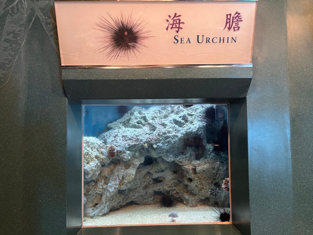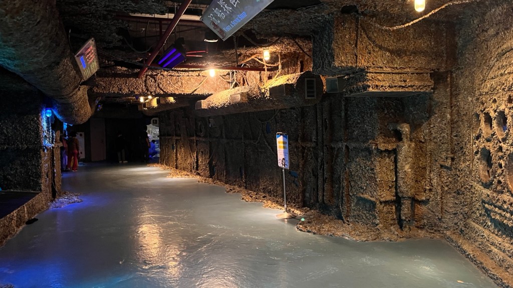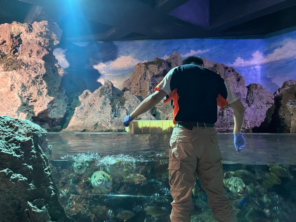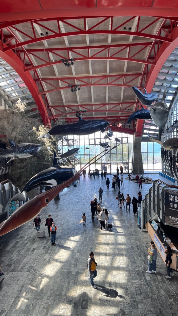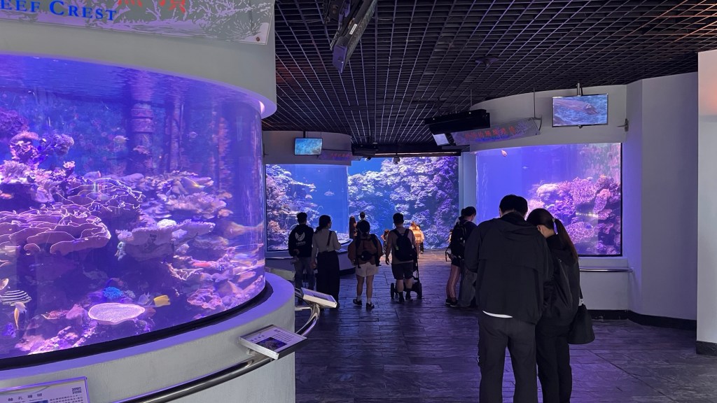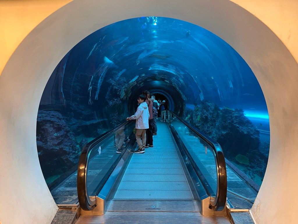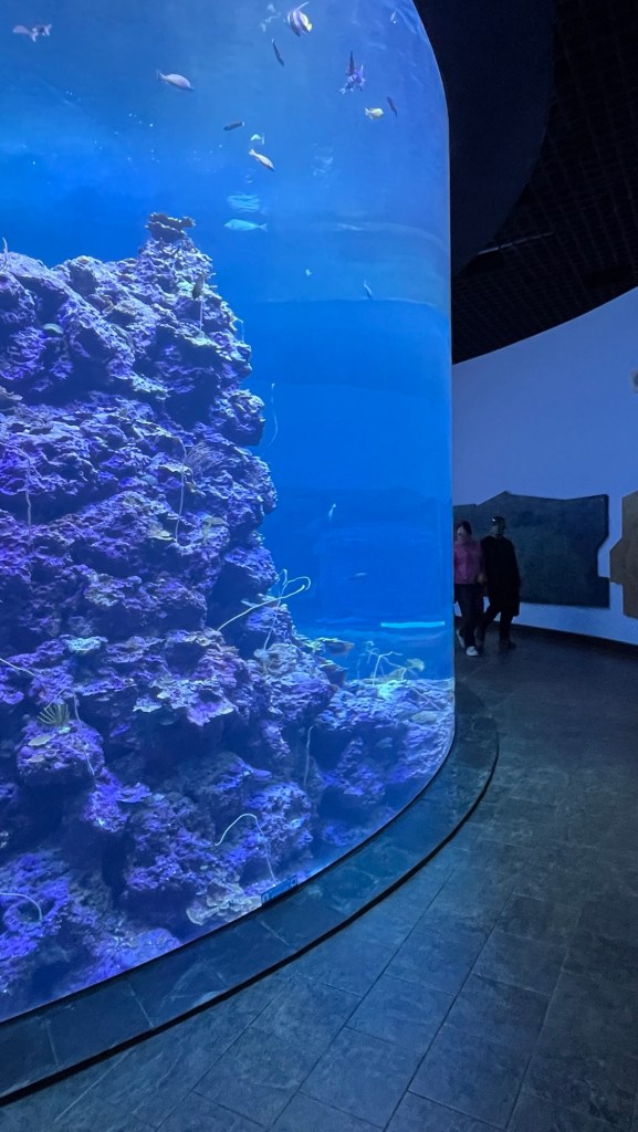 Der erste Rundgang fängt mit mehreren zylinderförmigen Aquarien an, die vornehmlich Korallen und ihre diversen Ausprägungen zeigen. Die Texte sind zwar ausschließlich auf Chinesisch, aber man kann, etwas umständlich, und wenn man nicht sowieso alles mit Google übersetzt, einen QR-Code einscannen und alles auf Englisch bekommen. Auf jeden Fall gibt es ganz nette Formen und Farben, die „brain coral“ bspw. sieht wirklich sehr nach einem Gehirn aus. Durch das leicht vermilchte Glas sieht die gezeigte Unterwasserwelt leider so aus, als würde irgendwas gammeln und das Leben dort früher oder später verschwinden. Das deckt sich also mit einer Google-Rezension, die das Museum für die später kommende Wasserwelt lobt, die Anlagen generell aber als „verranzt“ beschreibt.