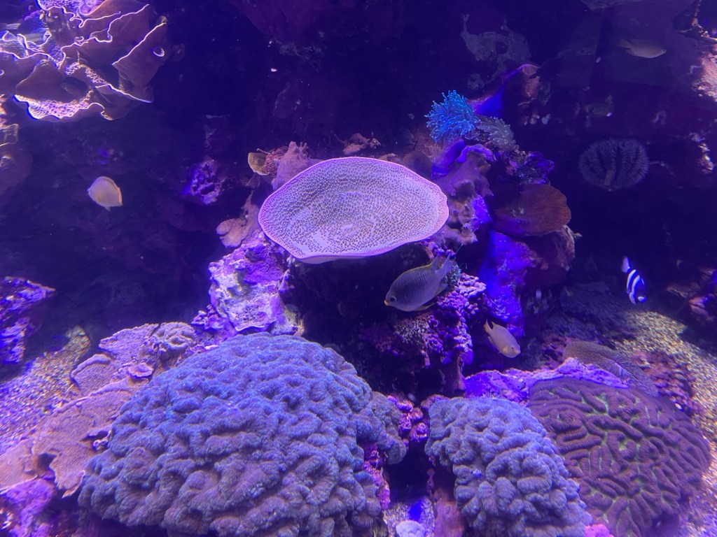 Das, was ich mir durchlese, ist eindeutig für Kinder oder Minderbemittelte geschrieben und geht wenig in die Tiefe. Das heißt nicht, dass ich alles schon wusste, im Gegenteil, aber schwer zu verstehen ist es auch nicht. Korallenriffe dienen vielen Meerespopulationen als Schutz vor starken Wellen und generell als Rückzugsort für den Vermehrungsprozess. Es folgt ein Riesenzylinder und mein inneres Kind kommt raus, das einfach nur Spaß hat, den Fischen beim Umhereiern zuzugucken und auf die Glubschaugen zu starren.
