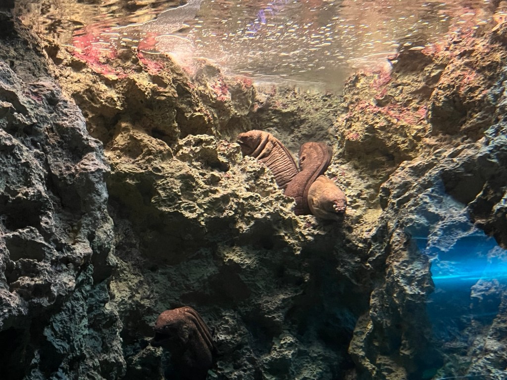 Zwischendurch lerne ich, dass dunkle Unterwasserhöhlen mehrheitlich von Peitschenkorallen („whip corals“) und Tassenkorallen („cup corals“) bevölkert wird. Sie bieten den Tieren Schutz, die nachtaktiv sind und das Tageslicht scheuen. Schluchtartige Tiefseecanyons haben einen ähnlichen Zweck, sie funktionieren außerdem hervorragend als vertikale Stadt der Meereswelt. Des Weiteren sind Aalschwärme zu sehen (ich habe ja gestern welche gegessen, insofern sehr interessant), die sich zu einer großen Kugel formieren, um Gegner abzuwehren. Moränen (bis jetzt wusste ich nicht einmal, wie diese Tiere aussehen) verstecken sich tagsüber in Spalten löchriger Felsformationen, wobei sie ihren Kopf rausgucken lassen, um ihr Territorium zu markieren. Junge verstecken sich hingegen gänzlich, sehr lustig anzusehen. Erst nachts trauen sie sich hinaus und fangen ihre Beute, also Garnelen und anderes Kleinvieh. Außerdem ist die Haut der Tiere so derart faltig und sie sind so derart massiv, dass sie mich sofort an einen berühmten Charakter aus Star Wars erinnern…