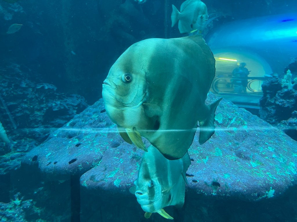 Eine Haupthalle teilt die zwei Ausstellungsgänge und präsentiert sich selbst mit mobileartigen Fischen, die von der Decke hängen. Unterwegs sind mal wieder Senioren sowie junge Familien, deren Sprösslinge sich wahnsinnig für schwimmende Fische begeistern können.