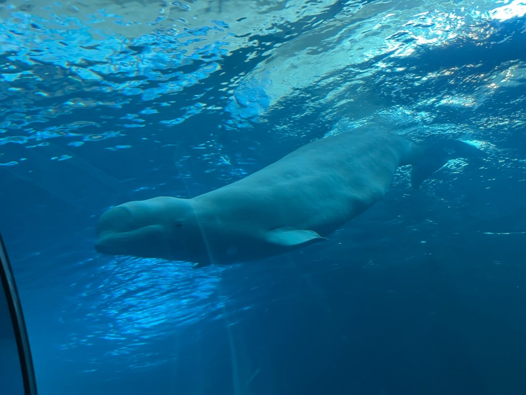 Danach folgt der obligatorische Hinweis auf das weltweite Korallensterben und dass bereits viel unternommen werde, um das zu verhindern. Aha, eine optimistische Botschaft also. Weitere Aquarien zeigen noch mehr interessante Fische, allerdings wird mir irgendwann schlecht. Die Glaswände sind entweder konkav oder konvex geformt, wenn man nicht gerade nach vorne durchschaut, verzerrt sich alles, so wie wenn man sich eine Brille mit falscher Stärke aufsetzt. Nachdem einige Skelette mittelgroßer Fische gezeigt werden, kommt die zweite Hauptattraktion: der Belugawal. Viele werden vor allem den nach ihm benannten Frachtflieger aus der Airbus-Werkstatt kennen, aber genau so sieht das Tier halt auch aus. In einem riesigen Becken, allerdings wirkt es ohne Dekorstion trist und karg, schwimmt der kleine Wal seine schnellen Runden. Jedes Passieren des Menschentunnels löst große „Ohh“s und „Ahh“s aus. Dass so ein spezielles Lebewesen hier aufwartet, überrascht mich ehrlich. Ein Mitarbeiter steht übrigens konstant im Tunnel und beobachtet, vermutlich das Verhalten des Tieres. Ich kann nur hoffen, dass es den Tieren gut geht, als Nicht-Zoologe ist das schwer zu beurteilen.