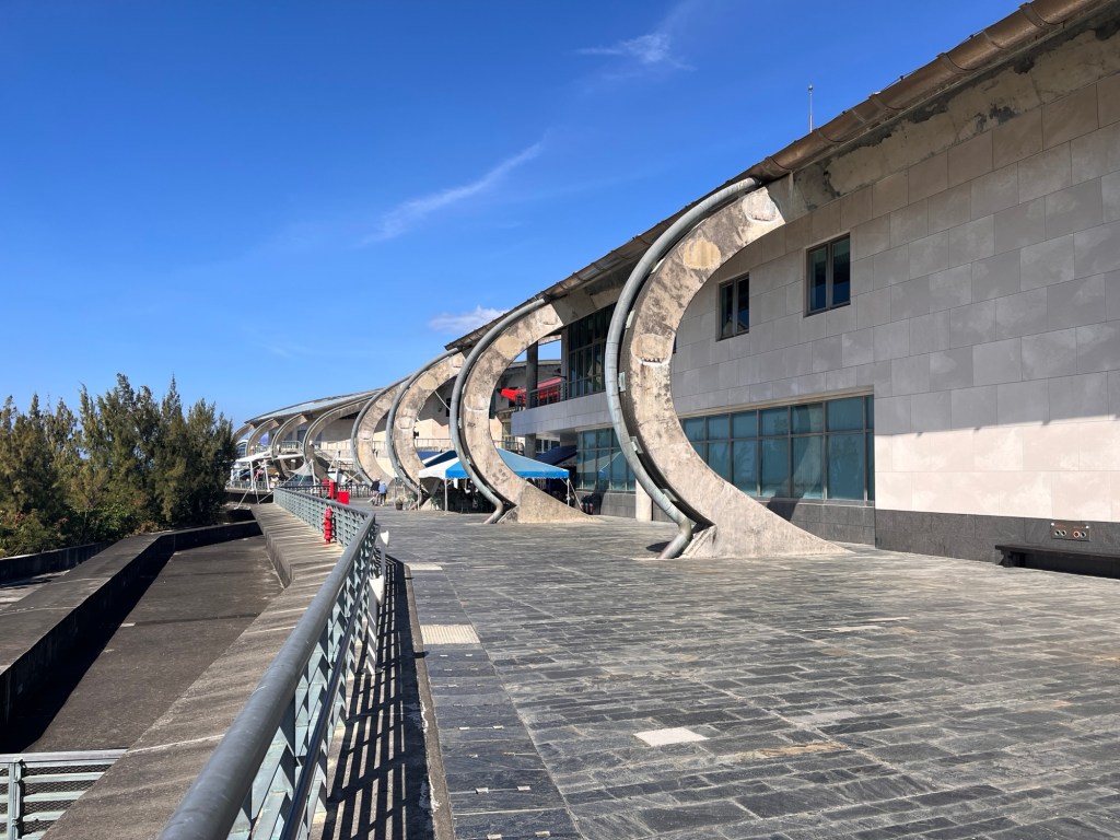 Nach einer recht spannenden Fütterung, in der alle Akteure wie verrückt auf die kleinen ins Wasser geworfenen Snacks feiern und sich gegenseitig aus dem Weg rammen, habe ich alles Wichtige gesehen und chille mich noch etwas auf die Museumsterrasse. Hier gibt es jede Menge Speisemöglichkeiten und sogar Spielplätze für die mitgebrachten Kinder. Am schönsten ist für mich aber der Meeresblick, auf dem sich die stark reflektierende Mittagssonne zeigt. Außerdem sieht man den Gebäuden von außen klar an, wie alt sie wohl sein mögen.