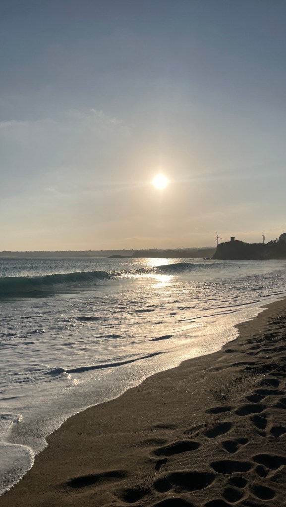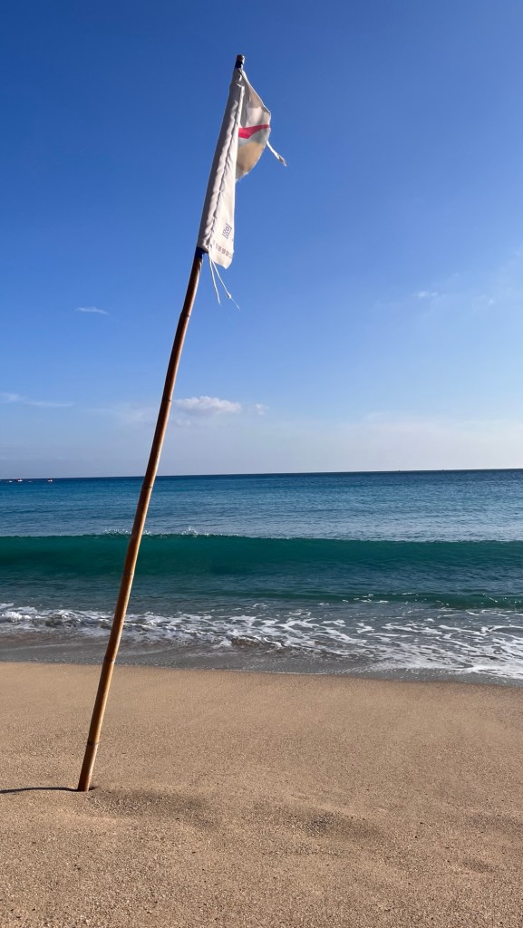 Der Strand in Kenting ist aber traumhaft, es gibt rein gar nichts auszusetzen. Er war ja bereits Ende Oktober ziemlich leer, und auch jetzt verteilen sich vielleicht zwanzig Leute über die Gesamtbreite, inklusive Strandpersonal auf Mini-Traktoren. Mit einem Wasser und einem ‚Honigbrot‘ setze ich mich an die natürliche Uferkante und schaue erst einmal lange zu, wie die Wellen Näherkommen und smooth wieder abziehen. Von einem Mitarbeiter lasse ich mir sagen, dass die eine Zone zwischen zwei Fahnen wirklich fürs Schwimmen gesperrt ist, warum auch immer, und setze mich weiter nach rechts. Die Sonne scheint einem ins Gesicht, auch mit Sonnenbrille noch ziemlich hell. Für den Untergang habe ich mir vorgenommen, nochmal nach Maobitou hochzufahren, wo ich im Oktober mit Verena war und den auch Dennis mir stark ans Herz gelegt hat, also gehe ich vorher ins Wasser. Um Wertsachen brauche ich mir keine Gedanken machen, die Teile rührt hier niemand an. Die Fahrradtaschen sind sowieso noch am Bike, das vor dem 7/11 steht, es könnte aber genauso gut in der nächsten Ortschaft stehen.