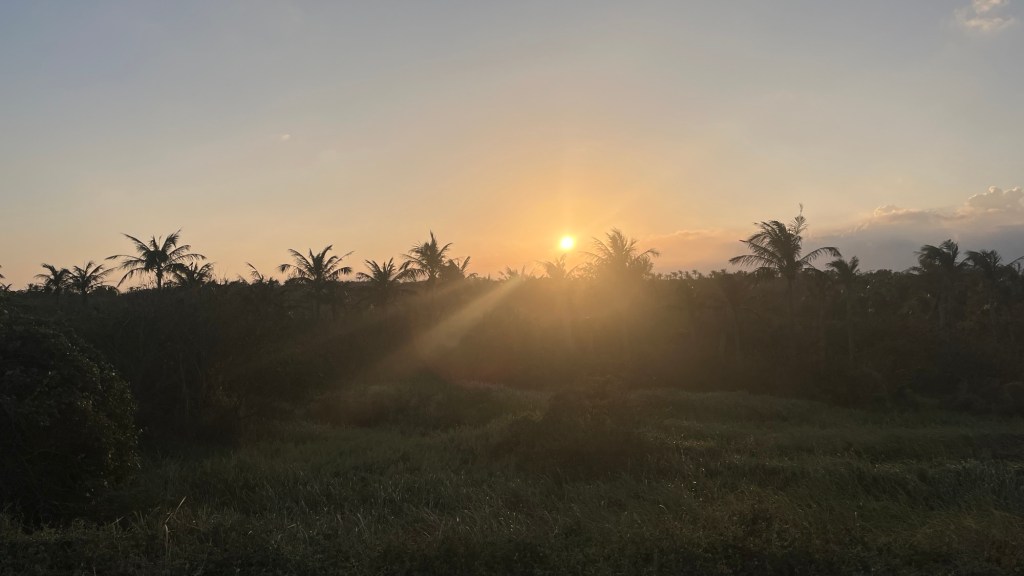 Das Wasser ist super warm, der Sand super weich. Noch mehr Superlative? Der Wellengang ist super angenehm, nicht zu hoch, nicht zu langweilig flach. Das Wasser ist super salzig, die Sonne super warm, kurzgesagt, hier zu baden fühlt sich super an. Obwohl ich ausschließlich auf den weichen Boden einer Sandbank trete, lässt mich der Respekt vor Seeigeln nicht los und ich walte vorsichtig. Als Wasserangsthase schwimme ich außerdem nicht weit raus, sondern lasse mich hin- und hertreiben, mache den toten Mann, hüpfe über die Wellen. Und ich beobachte die Landschaft. Im Süden sieht man vor allem Berge des Regenwalds und zwei farbige Häuserkomplexe, im Westen erstreckt sich die Landzunge, auf der der angesprochene Park liegt, außerdem besteht die Küste dort aus vielen Felsen.