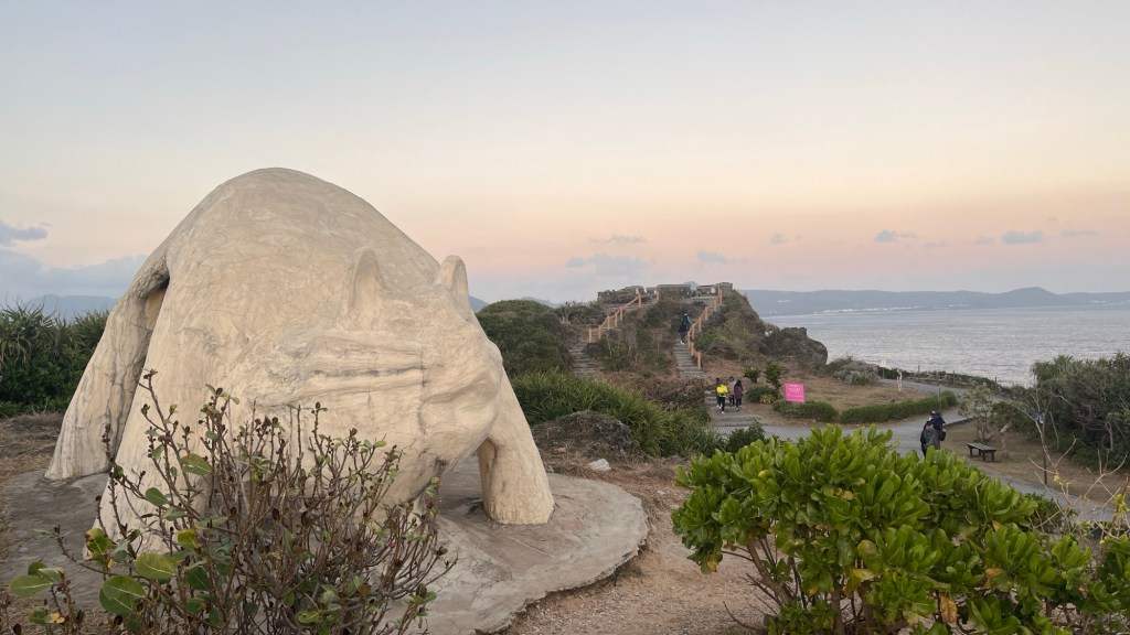 Trocknen tue ich im Wind sehr schnell. Rechtzeitig erreiche ich eine halbe Stunde später den 貓鼻頭公園 „Māo bítóu gōngyuán“, übersetzt den Katzennasenpark. Dem Namen alle Ehre machend, findet man natürlich jede Menge Katzen sowie eine große Katzenstatue. Landschaftsbilder von dort habe ich bereits Ende Oktober gepostet, wunderschön ist es immer noch. Besonders befreiend ist die Panoramasicht in fast jede Richtung, denn der Berg ist der höchste im Kollektiv der Landzungenhügel.