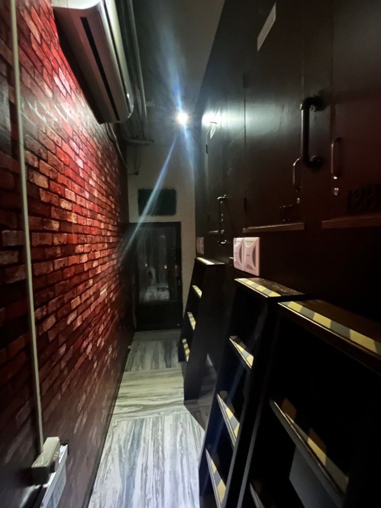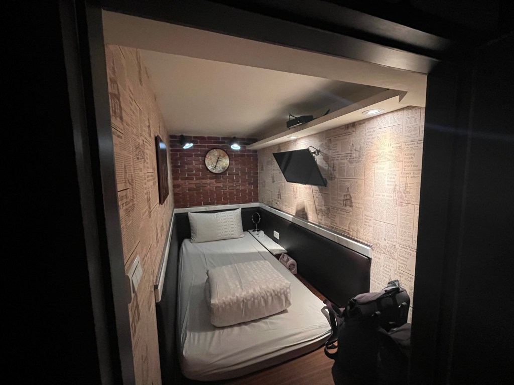 Zwar war die Route nicht besonders lang, trotzdem habe ich sie aufgezeichnet: hier der Komoot-Link. Das Hostel liegt direkt am Night Market, wie praktisch. „My Home“ heißt mich freundlich willkommen, nach Hinweisen auf Speise- und Raucherverbot bekomme ich auch schon den Zimmerschlüssel. Der Schlafsaal ist nicht nur in mit Wänden getrennte Kojen gegliedert, er fühlt sich geradezu an wie ein Tresor. Passend zu meinem Elternhaus bekomme ich die Nummer 12D und schließe mich zum Auspacken erst einmal ein. Die Wände sind mit historischem Zeitungspapier bedruckt und es gibt sogar einen Smart-TV und Lüftung. Für 400$TD (knapp 11€) gar nicht so schlecht.