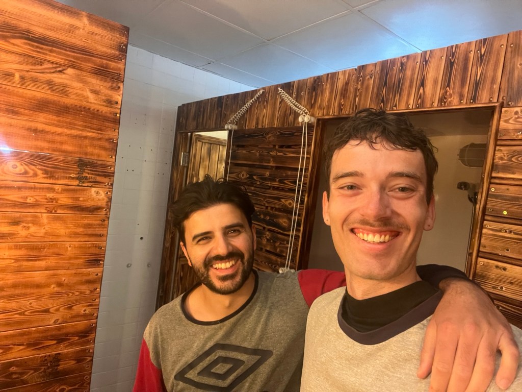 Im Gemeinschaftsraum höre ich zwei viel redende Stimmen. Durch eine Milchglas-Trennwand erkenne ich die Silhouette des sich beim alten Japaner einschmeichelnden Niederländers. Ich kenne keinen von beiden, aber irgendwie regt mich das zustimmende Gelächter von Letzterem auf. Allein die 2D-Projektion zeigt, wer wem mit erhobenem Zeigefinger die Welt erklärt und wer dazu sabbert wie ein Kleinkind. Ist ja nicht auszuhalten. Natürlich treffe ich Giuseppe nochmal beim Zähneputzen, und jetzt bekommen wir es auch gebacken, ein gemeinsames Bild zu schießen. Tatsächlich hat er sich gegen Lü Dao und für das Inland entschieden. Wer weiß, wo man sich nochmal zufällig trifft…