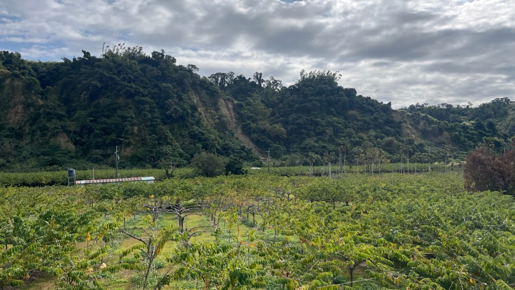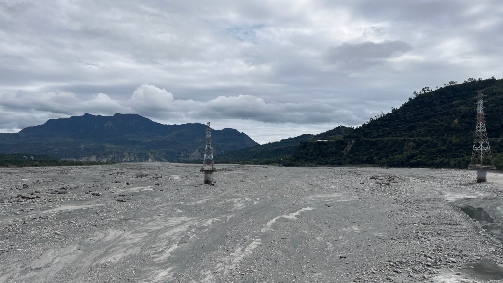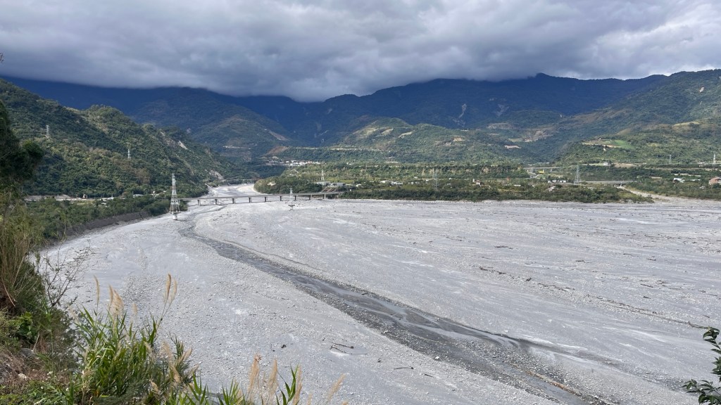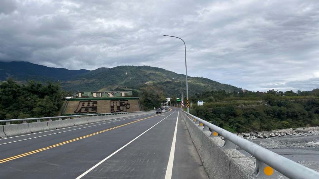 Wie ich später erfahre, lege ich beim Weg hinunter nicht ansatzweise die vorherige Steigung zurück, sodass das Tal insgesamt deutlich über dem Meeresspiegel liegen muss (auch wenn es kein bisschen auffällt). 鹿野 „Lùyě“ heißt die erste Ortschaft und begrüßt mich mit großen, naja, Schriftzeichen im Hollywood-Stil. Es gibt natürlich in ganz Taiwan diese Flussbetten (man könnte das Land sogar nach ihnen in Abschnitte teilen, ähnlich der nordmazedonischen Flagge), trotzdem faszinieren sie mich immer wieder. Zur aktuellen Trockenzeit fließt das Wasser, wenn überhaupt, nur durch einen winzigen Nebenkanal, sodass eine karge Steinwüste übrig bleibt, die sich bestens zum Wandern eignen würde. Ist garantiert verboten, auch weil in den meisten Senkungen Bagger herumfahren und arbeiten, aber schön wäre es wohl.