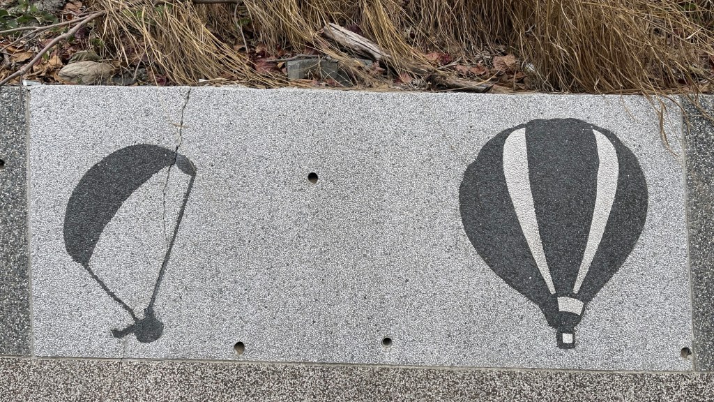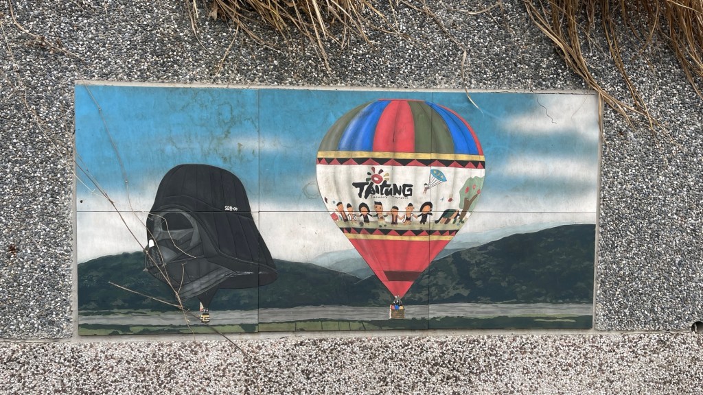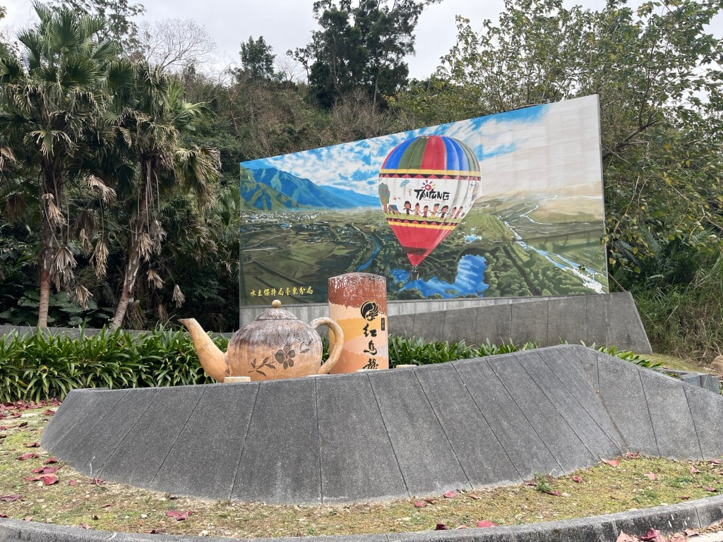 Hinter der Brücke zeigt das Fahrradroutenschild auf einmal zur Seite. Maps überzeugt mich, es zu versuchen, auch wenn es dadurch nochmal stark nach oben geht. Viel Strecke werde ich heute eh nicht machen und kann mir daher Zeit lassen und die Höhenmeterstatistik aufbessern. Die 鹿野高台 „Lùyě Gāotái“, also die Luye Highlands, kündigen sich an der Felswand mit humorvollen und schönen Bildern an. Es ist ein grundsätzliches Merkmal von Taiwan und seinen Nationalparks, Reserve Areas und wie das Zeug sonst noch heißt, dass ihre Eingänge nämlich zumeist mithilfe von konischen Steinen, zumindest angeschrägten Elementen, dekoriert werden. Das sieht gleichzeitig modern und nicht zu auffallend aus. Bei Häusern würde ich es nicht mögen, aber dafür passt es.