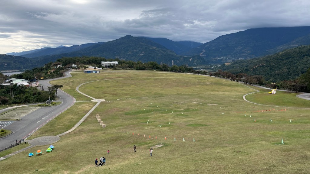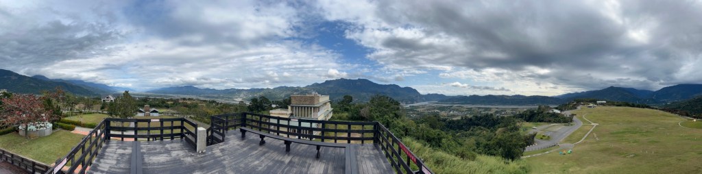 Die Abkürzung über einen Bauernhof spare ich mir aus allseits bekannten Gründen, es wäre eh sehr steil geworden. Stattdessen geht es mit moderater Neigung durch eine sehr einsame Visitor-Center-Anlage, in der die Bediensteten die einzigen Lebenszeichen senden. Am Hang sehe ich ein Tipi-Zeltlager, ein paar Obstbäume und immer mehr freie Flächen. Zwar findet heute keine Fliegershow statt, gelohnt haben wird es sich trotzdem. Ganz oben befindet sich nämlich eine Grünfläche, die nicht nur sehr groß, sondern auch wie ein Chip geformt ist, derjenige zum Essen. Hyperbolisches Paraboloid nennt man das glaube ich. Wobei die nach unten gekrümmte Parabel schon stärker ist, muss ich zugeben. Auf jeden Fall gibt es eine hölzerne Aussichtsplattform, auf der dann doch wenige Menschen zu sehen sind. Ich laufe hoch, lasse mich fotografieren und genieße den Rundumblick. Ich weiß gar nicht, ob ich ein vollständigeres Panorama in Taiwan bisher hatte. Entsprechende 360-Grad-Bilder habe ich stand jetzt nämlich kaum gemacht.