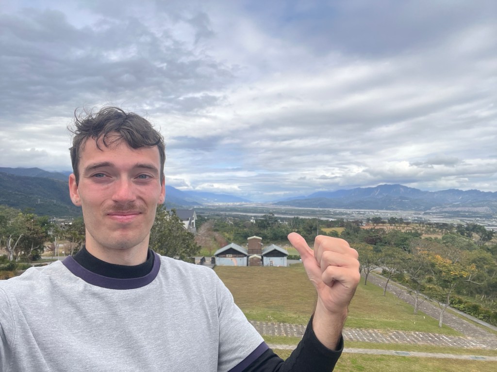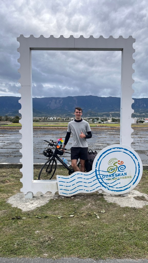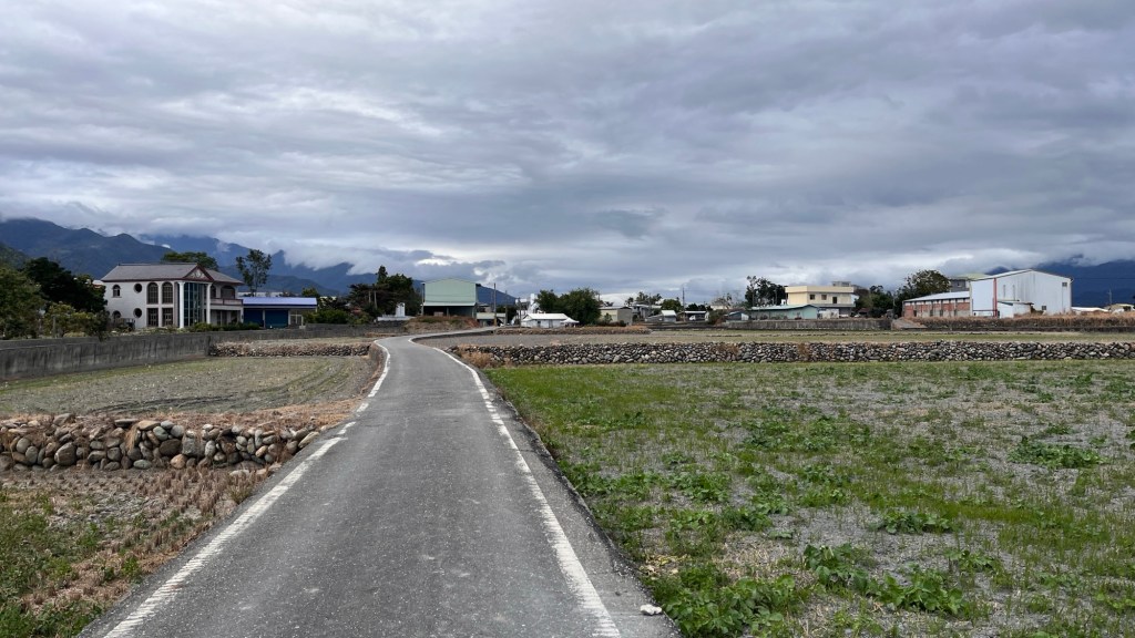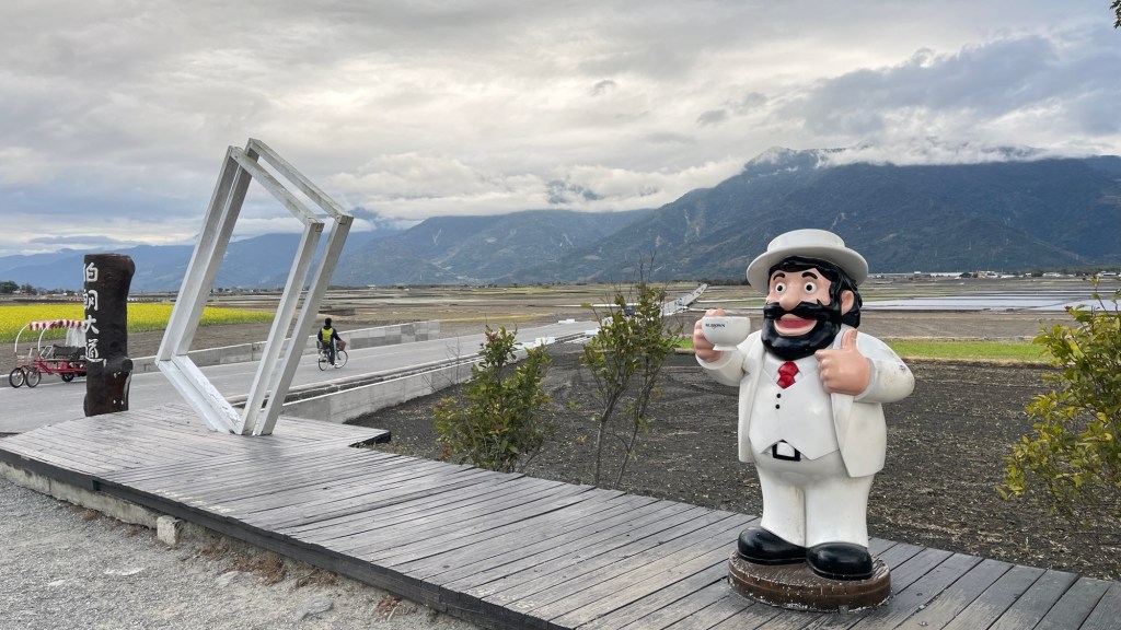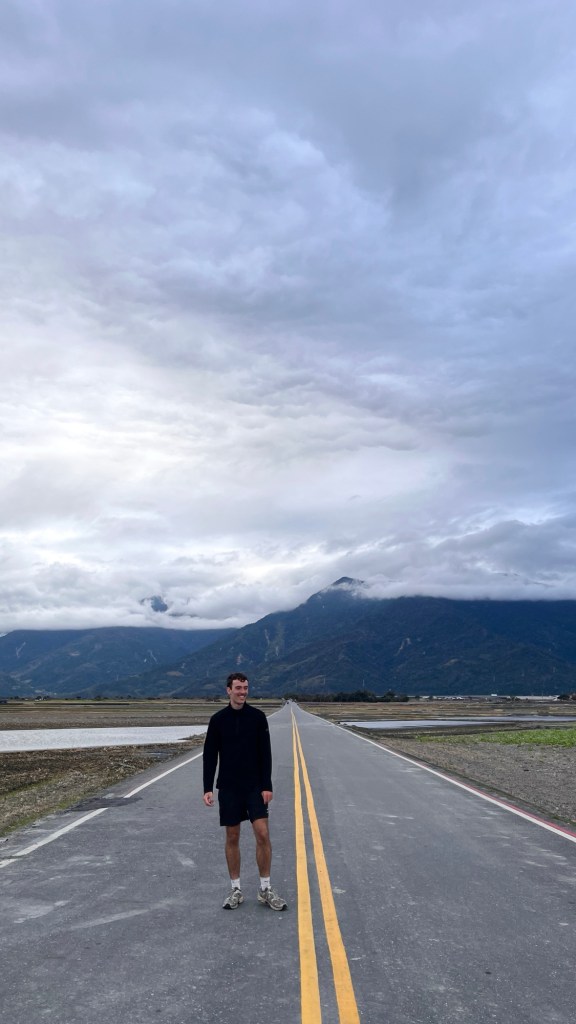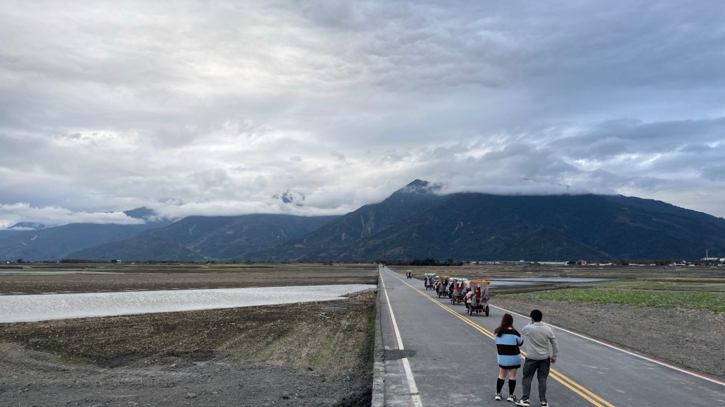 Dann ist es aber soweit: Ich erreiche den 伯朗大道畫框 „Bó lǎng dàdào“, den „Brown Boulevard“. Berühmt für sein einzigartiges Panorama, bedingt durch nichts als Felder außenrum und eine schräge Richtung im Vergleich zur Talausrichtung, lockt er selbst an diesem grauen Donnerstagnachmittag ein paar Touristen an. Selbstverständlich alles Taiwanesen, der komische Vogel bin immer noch ich. Dabei fahren sie fast alle wie die größten Vögel herum, mit ausgeliehenen Fahrmobilen. Als könnte man sich nicht einfach ein YouBike nehmen, oder noch besser, einen Spaziergang machen. Sowohl auf der Straße als auch vor einem berühmten Bilderrahmen, in den man sich stellen kann, wird mir bei den Fotos geholfen, wobei die Gruppe beim Rahmen eindeutig ausbaubedürftige Fotografierskills hat. Die Straße, vor allem die Sicht entlang ihrer Fluchtlinie ist aber auch genial. Obwohl das Wetter und damit auch die Farbigkeit der Landschaft maximal durchschnittlich ist, beeindruckt es. Für diesen Ort spreche ich eine uneingeschränkte Empfehlung aus.