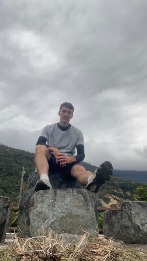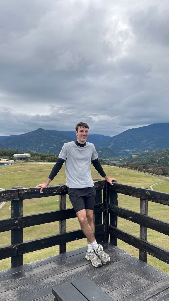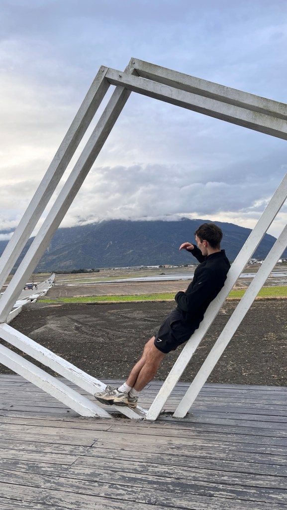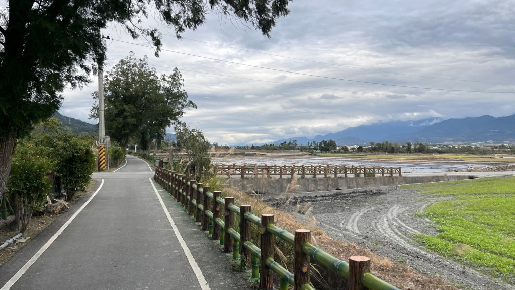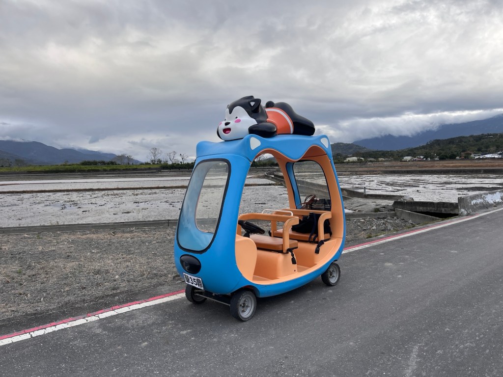 Dann ist es aber soweit: Ich erreiche den 伯朗大道畫框 „Bó lǎng dàdào“, den „Brown Boulevard“. Berühmt für sein einzigartiges Panorama, bedingt durch nichts als Felder außenrum und eine schräge Richtung im Vergleich zur Talausrichtung, lockt er selbst an diesem grauen Donnerstagnachmittag ein paar Touristen an. Selbstverständlich alles Taiwanesen, der komische Vogel bin immer noch ich. Dabei fahren sie fast alle wie die größten Vögel herum, mit ausgeliehenen Fahrmobilen. Als könnte man sich nicht einfach ein YouBike nehmen, oder noch besser, einen Spaziergang machen. Sowohl auf der Straße als auch vor einem berühmten Bilderrahmen, in den man sich stellen kann, wird mir bei den Fotos geholfen, wobei die Gruppe beim Rahmen eindeutig ausbaubedürftige Fotografierskills hat. Die Straße, vor allem die Sicht entlang ihrer Fluchtlinie ist aber auch genial. Obwohl das Wetter und damit auch die Farbigkeit der Landschaft maximal durchschnittlich ist, beeindruckt es. Für diesen Ort spreche ich eine uneingeschränkte Empfehlung aus.