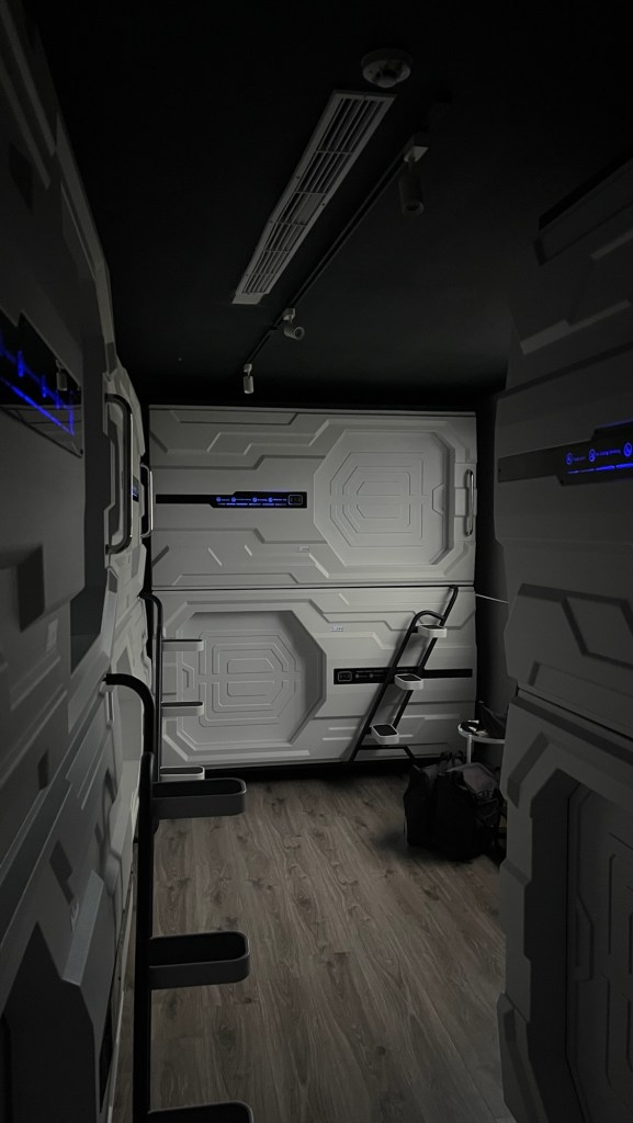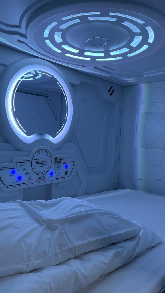 Mein Chishanger Hostel ist jedenfalls klasse! Die Frau am Tresen spricht perfektes Englisch, reicht mir zur Begrüßung eine Tüte Pocari-Sweat-Pulver (Elektrolyte) und überbringt die frohe Botschaft, dass das Frühstück morgen inklusive sei. Außer mir nächtigt nur eine andere Frau und die Einrichtung ist liebevoll gestaltet: Organische Deckenpaneele, eine Sofaecke mit Bücherregal in der Lobby, Platz zum Abstellen meines Fahrrads, einige Pflanzen, Wandbemalung und -bebilderung, ein Aquarium. Das Obergeschoss ist abgespaced, und das meine ich wörtlich. Neunfarben in den quadratischen Regalfächern, steril weiße Möbel und der Schlafsaal toppt alles. Jedes Bett ist eine eigene Kapsel, die bestimmt nicht nur zufällig im Raumschifflook gestalten wurde. Mit der persönlichen Chipkarte, die übrigens in einem handgeschriebenen Umschlag serviert wird, kann man die Schleusentür zum Bett öffnen. In dem sieht es nach acht Monaten Marsmission aus, verschiedene Lichteinstellungen erzeugen weltraumhafte Atmosphäre und totale Anonymität. Irgendwie cool, nach so vielen Billo-Unterkünften. Bei Fragen soll man sich sofort melden, tatsächlich empfiehlt die Rezeptionistin ein vegetarisches Restaurant um die Ecke. Und das, obwohl das Hostel selber Speisen anbietet. Die 585$TD (15,80€) würde ich fast gerne ein zweites Mal zahlen, aber morgen soll es regenfrei bleiben, was mir beim Fahren gelegen kommt. Außerdem habe ich die Attraktionen hier in der Gegend jetzt ja schon gesehen.