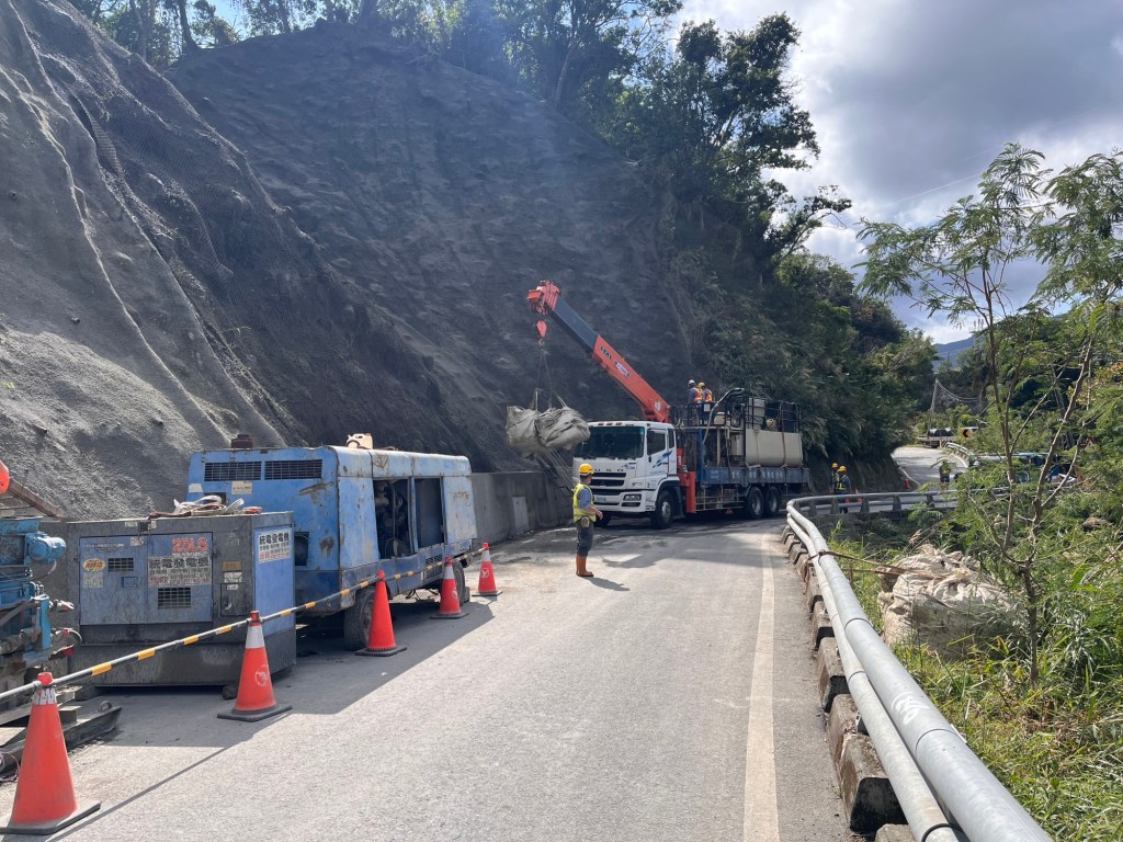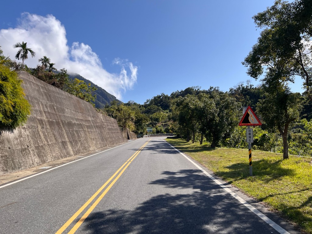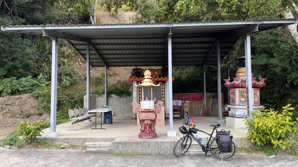 Heute schon lange Sachen anzuziehen, war nur eine semi-gute Idee. Es ist viel wärmer als gestern Abend und natürlich schwitzt man sich bei einem Aufstieg den letzten Tropfen ab. Wenigstens kaschieren meine langen Ärmel möglichen Sonnenbrand, die Creme ist auf die Schnelle kaum aufzufinden (ohne alles einmal auszupacken). Die Straßenneigung ist übrigens viel angenehmer als bei den meisten Bergen zuvor und fügt sich bestens in die Kurven der Bergstraße. Die Teerung kann noch nicht lange her sein und alle paar hundert Meter steht ein weißes Schild mit einer Telefonnummer, die man bei Sichtung von Straßenschäden anrufen soll. Ab einem gewissen Punkt erreicht die Straße einen Bergsattel, der die Grenze zwischen den Landkreisen Taitung und Hualien darstellt. Der höchste Punkt ist damit fast erreicht, eine kleine Andachtsstätte zelebriert das. Es ist keine Seele vor Ort, aber es stehen Wasserflaschen, leere Bierflaschen, jede Menge Asche und anderer Kleinkrams umher.