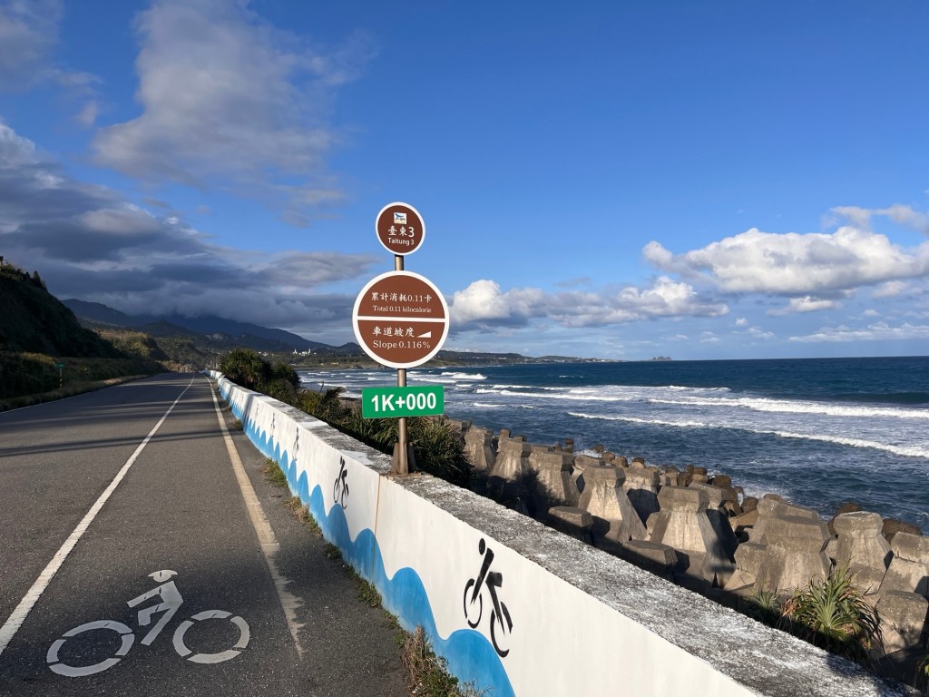 Straßenschilder warnen vor Kühen, und vom nahegelegenen Ufer kann ich sowohl Lü Dao im Südosten als auch bereits die 三仙台嶼 „Sānxiān tái yǔ“ -Insel im Nordosten erkennen. Ab und zu gibt es kurze Radwege entlang des Ufers, die dann so kreativ mit „Taitung 8“ oder ähnlich bezeichnet sind. Acht Minuten vielleicht… Alle hundert Meter gibt ein neues Schild sogar bis auf die dritte Nachkommastelle an, wieviel Prozent die Steigung hat und wieviele Kilokalorien man bereits verbrannt hat. Nette Idee, aber bei so kurzen Distanzen wirken die Angaben auf mich etwas lächerlich.