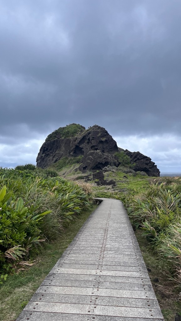 Außer mir sind eine Handvoll weitere Schaulustige und drei Fischer in Ponchos bereit, die frühen Morgenstunden zu nutzen. Ich habe aber den größten Zeitdruck und eile daher vor allen anderen auf die Insel. Es ist nicht zu unterschätzen, wie weit man auch auf dieser noch laufen kann, ein Steg durch die Sträucher zieht sich in die Länge. Man soll keine Tiere füttern, denn das Ökosystem sei sehr empfindlich. Hinter dem ersten Felsen erscheinen weitere, und auf einen kann man sogar hinaufklettern. Von dort kann ich in viele Richtungen schauen, ebenfalls sehr beeindruckend. Den letzten Part zum Leuchtturm und den Klippen direkt am offenen Meer bestreite ich leider nicht, denn ich habe meine Regenjacke noch beim Fahrrad und will keine Volldurchnässung am Beginn der Tagestour riskieren.
