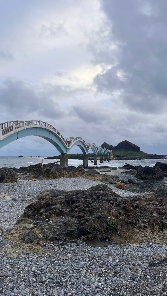 Nicht einmal ansatzweise bin ich seit Tourbeginn so früh aufgestanden wie heute. Aber die Strecke fährt sich nicht von selbst, deshalb geht’s ab sechs Uhr auf die Socken. Draußen ist es lauwarm, jedenfalls friere ich in Unterhose nicht sofort ein. Auch ist es schon sehr hell, obwohl der Sonnenaufgang noch auf sich warten lässt. Still und heimlich verlasse ich das Gut und düse bis zur 三仙台橋 „Sānxiāntái qiáo“, der achtbogigen Brücke von gestern. Sie liegt am Ostzipfel des hiesigen Küstenabschnitts und führt auf eine unberührte grüne Insel. Von Sonne ist zwar keine Spur, aber die dunklen Wolken und die rübergehende Gischt erzeugen eine unheilvolle Spannung. Episch.