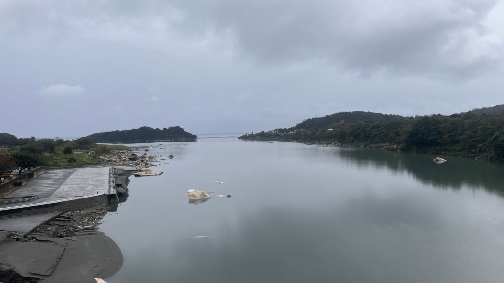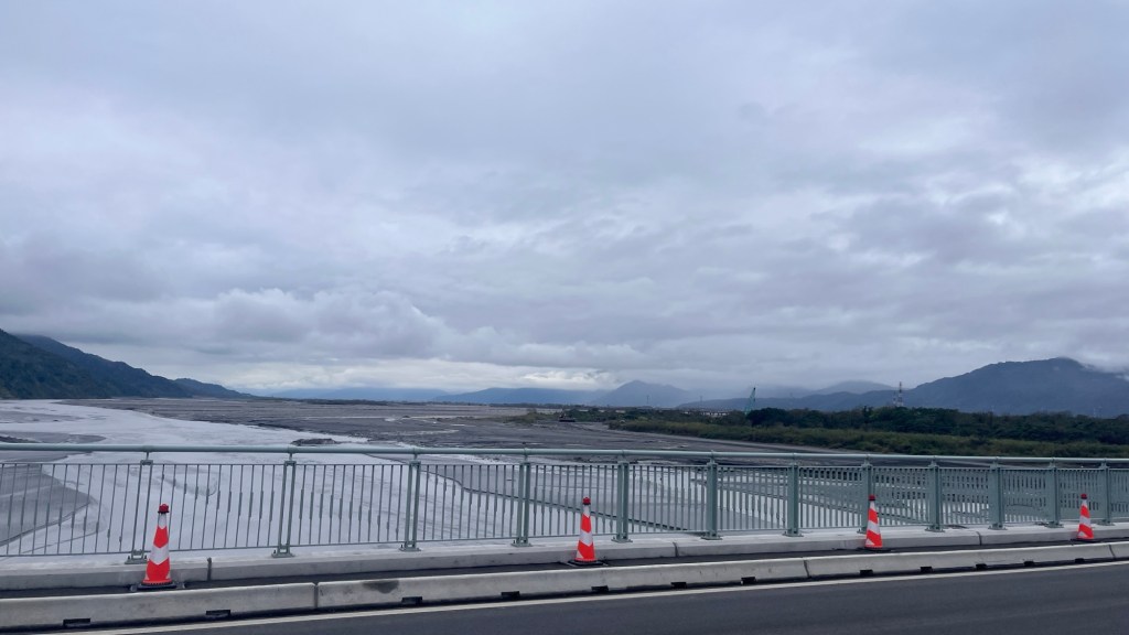 Woher auch immer, bekomme ich auf die letzten Meter noch einen Energieschub und kann mehr Kraft in die Pedalen stecken, als gedacht hätte, dass meine Oberschenkel es krampfmäßig zulassen. Vielleicht muss mein Kopf unbedingt die Durchschnittsgeschwindigkeit von 21 km/h halten, ein qualvolles, aber effektives Durchhalteinstrument. Bei der nächsten Tour muss ich auf jeden Fall mal weniger auf die Live-Daten schauen. Jedenfalls gibt Hualiens im horizontalen Dunst versunkene Skyline Motivation, und auch als ich den extrem breiten Fluss des Talausläufers überquere, weiß ich, es geht voran.