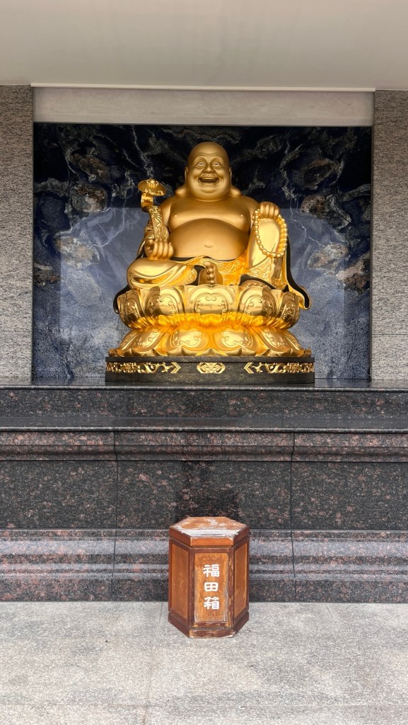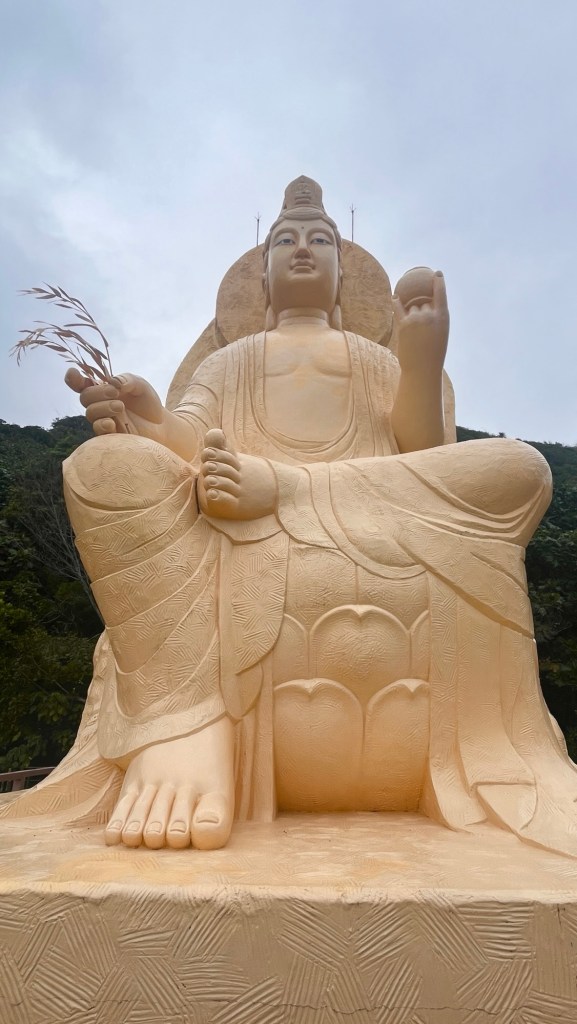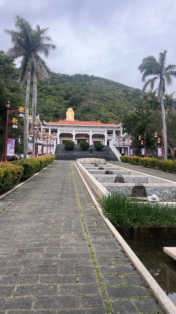 Allerdings entdecke ich ca. eine Stunde vor Fahrschluss, kurz vor dem Abbiegen ins Inland, noch einen wunderschönen Tempel. Der 花蓮壽豐和南寺 „Huālián shòu fēng hé nánsì“ Henan Temple, dessen Name auf die örtliche Situation im Landkreis Hualien anspielen dürfte, liegt am Hang und zieht mit einer ausgefallenen, goldenen Buddha-Statue Aufmerksamkeit an sich. Der palmengeschmückte Aufgang sowie die gelblich beige Akzentfarbe an den Dächern einiger Campusbauten gefällt mir richtig gut. Dazu wartet an der obersten Spitze noch meine heutige Buddha-Statue, mit der ich nun wirklich nicht mehr gerechnet habe. Diejenige am Eingang zählt nicht ganz, weil ihr Format ein anderes ist und das emotionale Grinsen nicht zu dem Stil aller bisherigen Varianten passt. Im Grund genommen ist das unfassbar geiles Geocaching! Bestimmt niemals mit der Intention erbaut worden, aber ich sammle die Dinger jetzt trotzdem. Wieviele Statuen es wohl noch gibt? Und ich meine wirklich nur die im fotografierten Format. Der Blick von ganz oben ist mal wieder super, unterscheidet sich von den bisherigen heutigen Sichten aber wenig, weshalb ich auf ein Bild getrost verzichten kann. Wenige Leute beten im Hauptgebäude, zwei Frauen haben eine scheinbar lange Unterhaltung neben der Statue und beginnen zu spazieren, als ich auftauche.