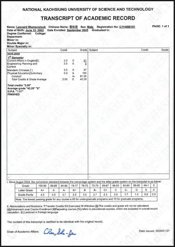 Netterweise schickt die NKUST mir auch noch eine Mail, mit warmen Verabschiedungsgrüßen und einem PDF, das mir endlich die Noten der Abschlussprüfungen gibt. In Chinesisch habe ich 97 Punkte, damit bin ich zufrieden. Im Bogenschießen sind es sogar volle 100, was ich mal nicht zu ernst nehme (auch wenn ich mich im Lauf des Semesters wirklich verbessert habe). Am lustigsten ist aber, dass mir „English in Foreign Affairs“ 51 Punkte gutschreibt, obwohl ich nach vier Wochen abgebrochen hatte. Habe ich eigentlich schonmal betont, wie sehr einem die Noten hinterhergeschmissen werden und wie das Bildungssystem zugrunde geht? Der erste Ingenieurskurs bringt dann immerhin verdiente null (ich war ja auch nur einmal da), was den Punkteschnitt auf 42 reduziert. Eigentlich ist das Dokument total egal, aber irgendwie bin ich auch froh, eine Chinesisch-Bescheinigung zu erhalten.
