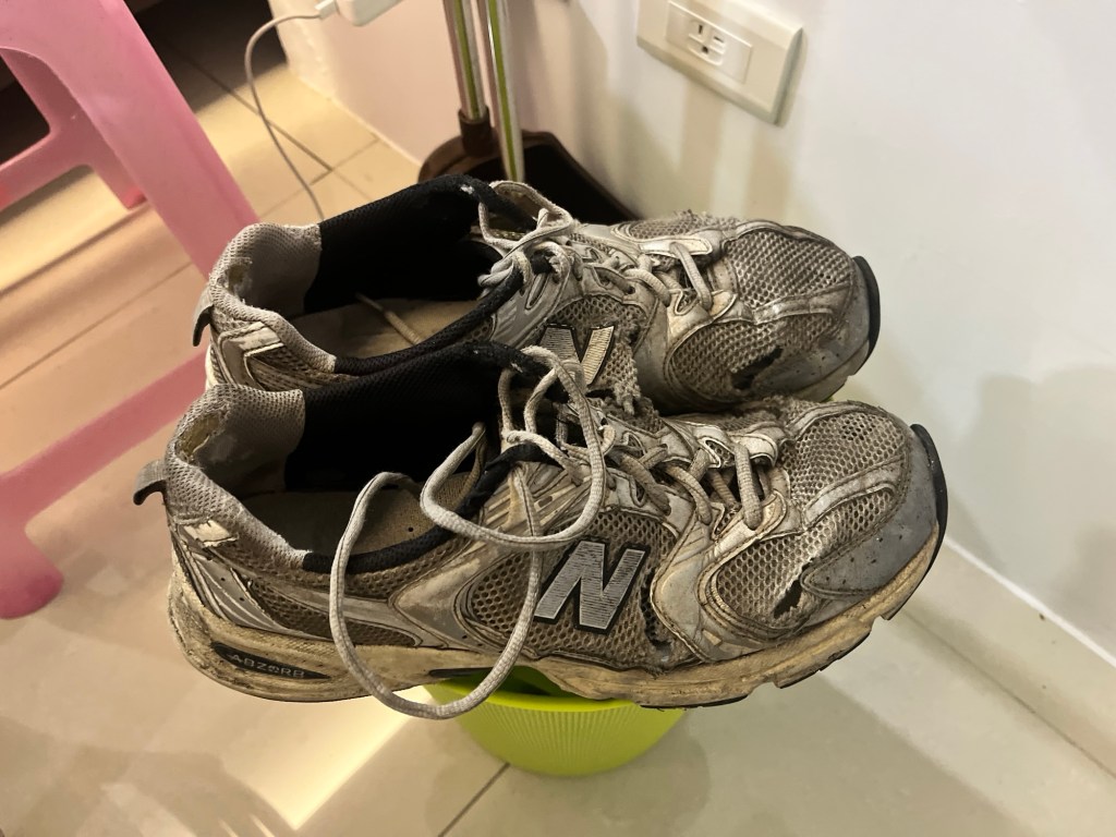 Die beiden Bamberger jedenfalls werden mir bis Dienstag früh Gesellschaft leisten, dann verschwinden sie gänzlich aus Taiwan. Verängstigt fragen sie nach den Kakerlaken, aber keine Sorge, ich hab alles im Griff. Außer scheinbar das Staubsauger-Terrarium, welches mich am wenigsten stört. Schließlich entsorgen wir das Ungeziefer im Hausmüll. Ob das inhaltlich sinnvoll, bezweifle ich mal, genau dort fühlen sie sich am wohlsten, aber dafür hat die Wohnung erst einmal Ruhe. Ebenfalls entsorgen kann ich jetzt auch meine gottlos verhunzten New Balance, die wirklich mehr als fällig sind.