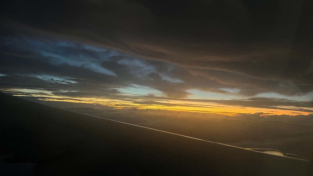 Mr. Mark steckt sich zum Abflug (genau wie ich) Kopfhörer rein und pennt quasi sofort ein. Er fällt dabei ein bisschen weit in meine Richtung, aber es hält sich Grenzen. Ich höre mir wie auf den letzten Flügen mal wieder Mike Oldfield an, das entspannt mich. Der Flieger hebt nämlich erstaunlich flach ab und wackelt sowohl bei Start als auch Landung viel mehr als der vorherige, müssen wohl die Turbulenzen sein. Pünktlich zur Landung geht die Sonne auf, über den Wolken immer ein besonderes Schauspiel.