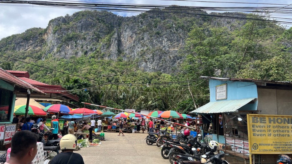 Der Flughafen Puerto Princesa fühlt sich noch kleiner an als der in Bohol, nach dem Ausstieg laufen die Passagiere das halbe Rollfeld hoch. Die einzige Toilette in Reichweite ist schnell komplett überfüllt, schnell raus hier. Um halb sieben hat natürlich noch kein Internetcafé geöffnet, wo ich meine Geräte laden könnte, also schaue ich mich gleich nach einem Bus in Richtung El Nido um. Google zeigt eine vor dem Flughafen abfahrende Linie an, das ist mein einziger Anhaltspunkt.