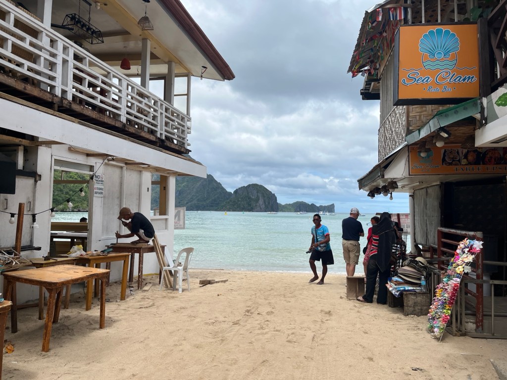 Hatte es zwischendurch noch geregnet, so ist es jetzt brennend heiß, als wir den Van um kurz nach elf verlassen. Auf der Hauptstraße von El Nido blüht der Handel, der wirklich das einzige Geschäftsfeld darstellt, neben den üblichen Stransportheinis. „You want to rent, Sir? Tuk tuk“ sagt der Mann und dreht seine rechte Hand. Allein in der ersten Minuten verteile ich zehn Absagen, dann wird es schrittweise weniger. Der Schwede verschwindet sofort, mit den Franzosen laufe ich noch kurz in dieselbe Richtung. Die Kulisse rundherum ist überwältigend, jede Menge Felswände schießen nach oben, beeindruckender als jeder Schokohügel. Nachdem die Franzosen ihr Hostel gefunden haben, bin ich wieder alleine. Noch nie habe ich auf einem Fleck so viele Backpacker gesehen wie im Stadtzentrum von El Nido, das ist der schiere Wahnsinn. Das fühlt sich so falsch an. Sollte man als Solotraveller nicht eigentlich in der Minderheit sein?? Okay, nicht jeder ist Backpacker, es gibt auch einfach sehr viele normale Touristen. Zumindest im Zentrum sind die Filipinos in der Minderheit. Ich sehe eine wohlriechende Bäckerei, aber die spare ich mir für später auf. Die Hauptstraße entfließt irgendwann einfach dem städtebaulichen Gefüge und endet im Sand, der nur fünf Meter weiter das Meerufer bildet. Bei genauerer Betrachtung verhält sich das hier überall so. Der Strand ist ein einziger Gummipuffer, der die Bebauung vom direkten Wasserkontakt abhält.