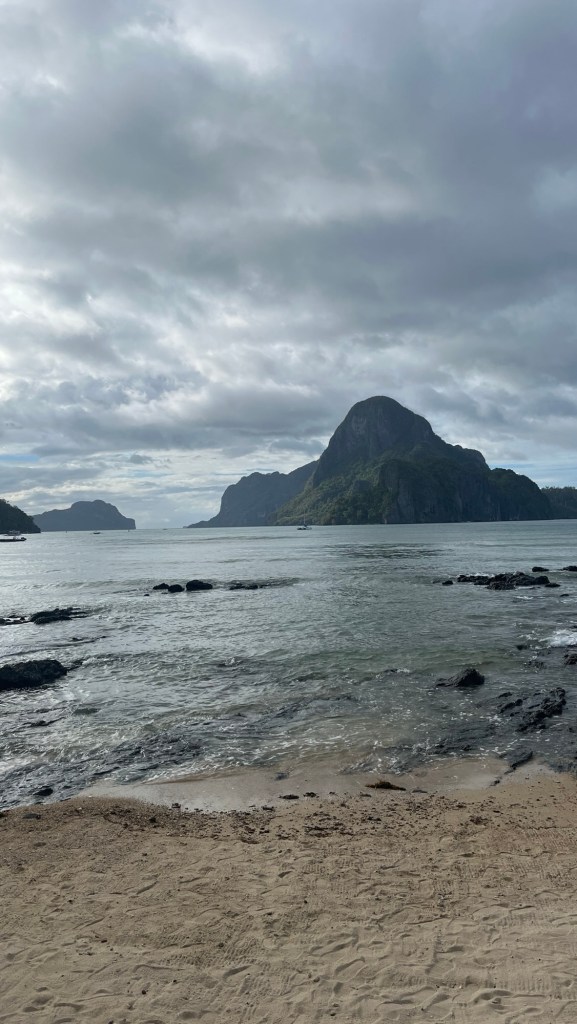 Das macht den Ort aber gleich viel schöner. Mir rinnt ein Wow über die Lippen, als ich den Blick von links nach rechts schweifen lasse. Eine große Zahl Boote haben sich im ruhigen Wasser niedergelassen, es gibt kaum Wellen. Die Bucht wird von den bereits gezeigten hohen Felsbergen begrenzt, dazu sieht man eine vorgelagerte Insel, ebenfalls hoch, die vermutlich eine gute erste Verteidigunglinie gegen Naturkatastrophen aller Art ist. Oder die Tsunamis und Taifune erreichen El Nido erst gar nicht, was wirklich sein kann, schließlich liegt Palawan viel westlicher als alle anderen philippinischen Inseln. Irgendwie müssen Häuser am Wasser ja funktionieren. Weil mein Hostel dummerweise fernab liegt, laufe ich erstmal den ganzen Strand hoch und eine ganze Bucht weiter, wo das Treiben zwar noch rege, aber ruhiger ist.